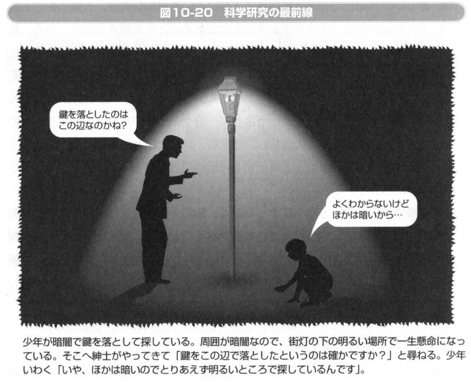 図10-20(イラストに載せます)は、科学研究の最前線を風刺した絵である。誰かが建てた街灯の下で宝探しをするというだけでなく、まだ闇に包まれている世界に飛び出して、新たな街灯をともすような意気込みが必要だ。地球科学の歴史を振り返ると、まだ闇の部分に新しい学問分野が眠っていることは明らかである。科学的深求で闇に包まれた世界に光を当てることは喜びであり、やりがいのある営みである。だが、未開の分野を切り開くには多大な時間と労力が必要とされる。目先の利益ばかりを追求する風潮のなかで、地道な研究を支える健全な科学と社会のパートナーシップがますます求められるようになっている。