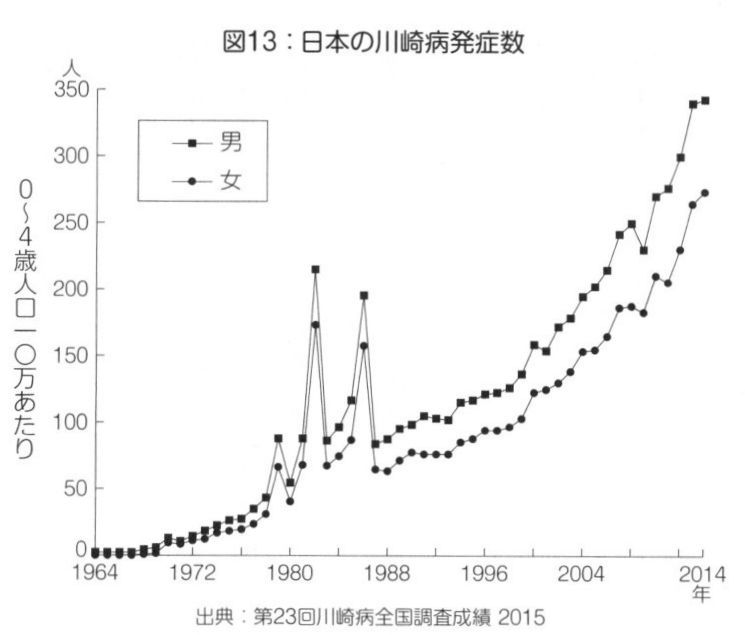 深刻なことに、日本での川崎病は、世界一の頻度です。全国調査では、右肩あがりにふえていて(図13)、二〇一四年は一万六〇〇〇人。ただし、調査では、質問に回答しなかった医療機関が二五%ほどあるため、実数はもっと多いはすです。この傾向がつづいていけば、二〇一七年には二万人を超えていることでしよう。近年の出生数は年一〇〇万人前後なので、新生児一〇〇人につき二人がいつか発症する勘定です。--子どもの健康をまもるため、ぜひとも対策が必要です。