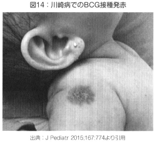 そして、川崎病の発症時にBCG接種部位が赤く腫れあがる患児が多数います(図14)。写真にみるように、BCG接種部位の周囲に発赤か広がっていて、なかには潰瘍化するケースもあります(以下、BCG発赤。と呼ぶ)