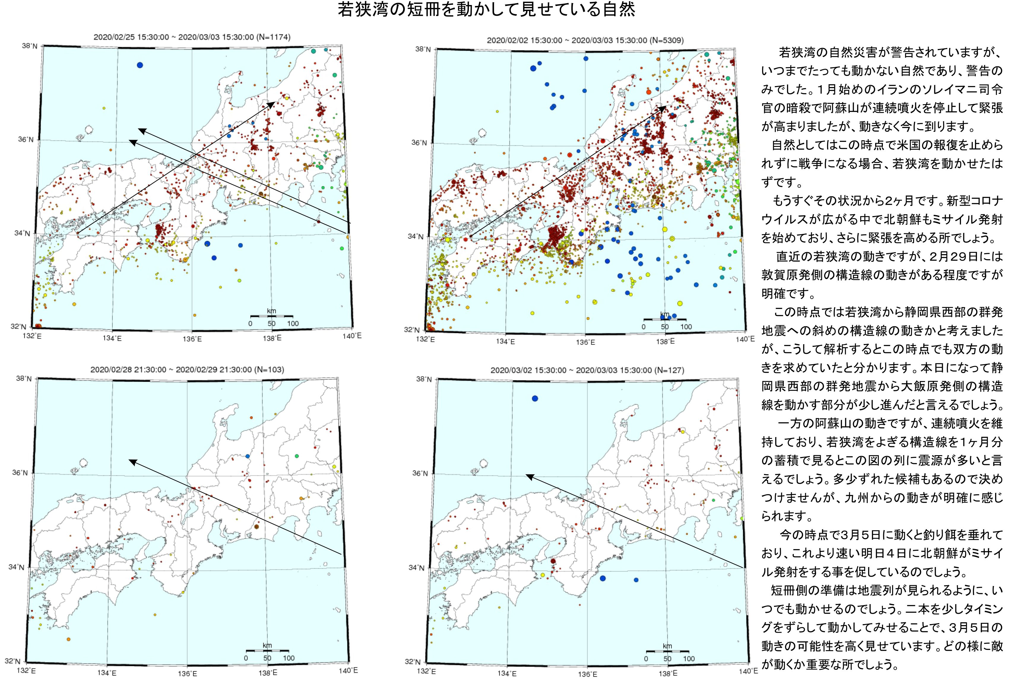 若狭湾の自然災害が警告されていますが、いつまでたっても動かない自然であり、警告のみでした。1月始めのイランのソレイマニ司令官の暗殺で阿蘇山が連続噴火を停止して緊張が高まりましたが、動きなく今に到ります。