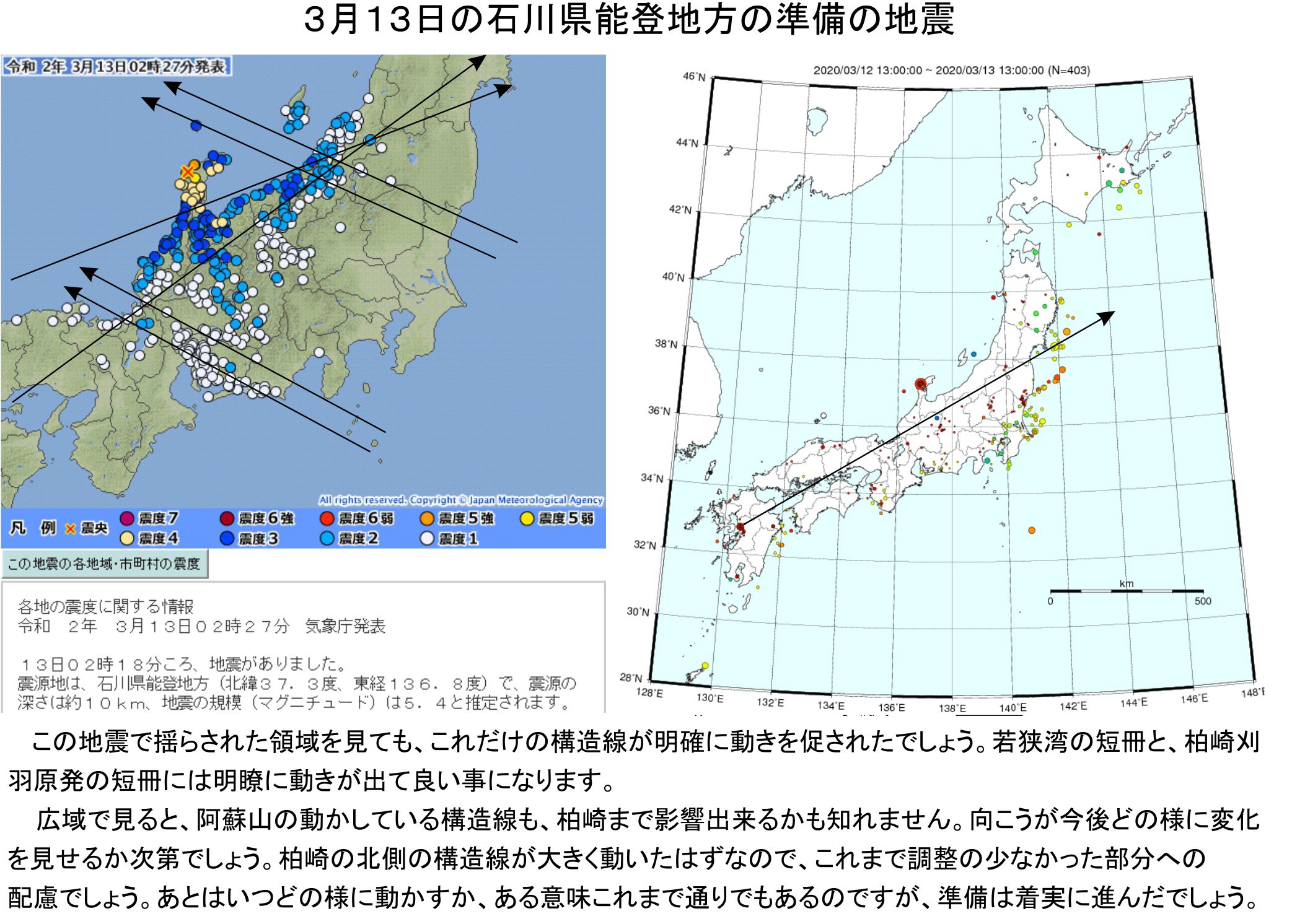 2時18分に石川県能登地方でM5.4、震度5強の地震が起こされて、広域に影響しています。50分前でしか偽善の側にも分からないほどに隠してきた準備の地震でしょう。柏崎刈羽原発と敦賀原発、大飯原発を通る構造線を大きく刺激する地震であり、これから動かす上での準備で間違いないでしょう。もちろん先送りも出来るでしょうが、愚かな行為になるだけです。以下組み込みです。