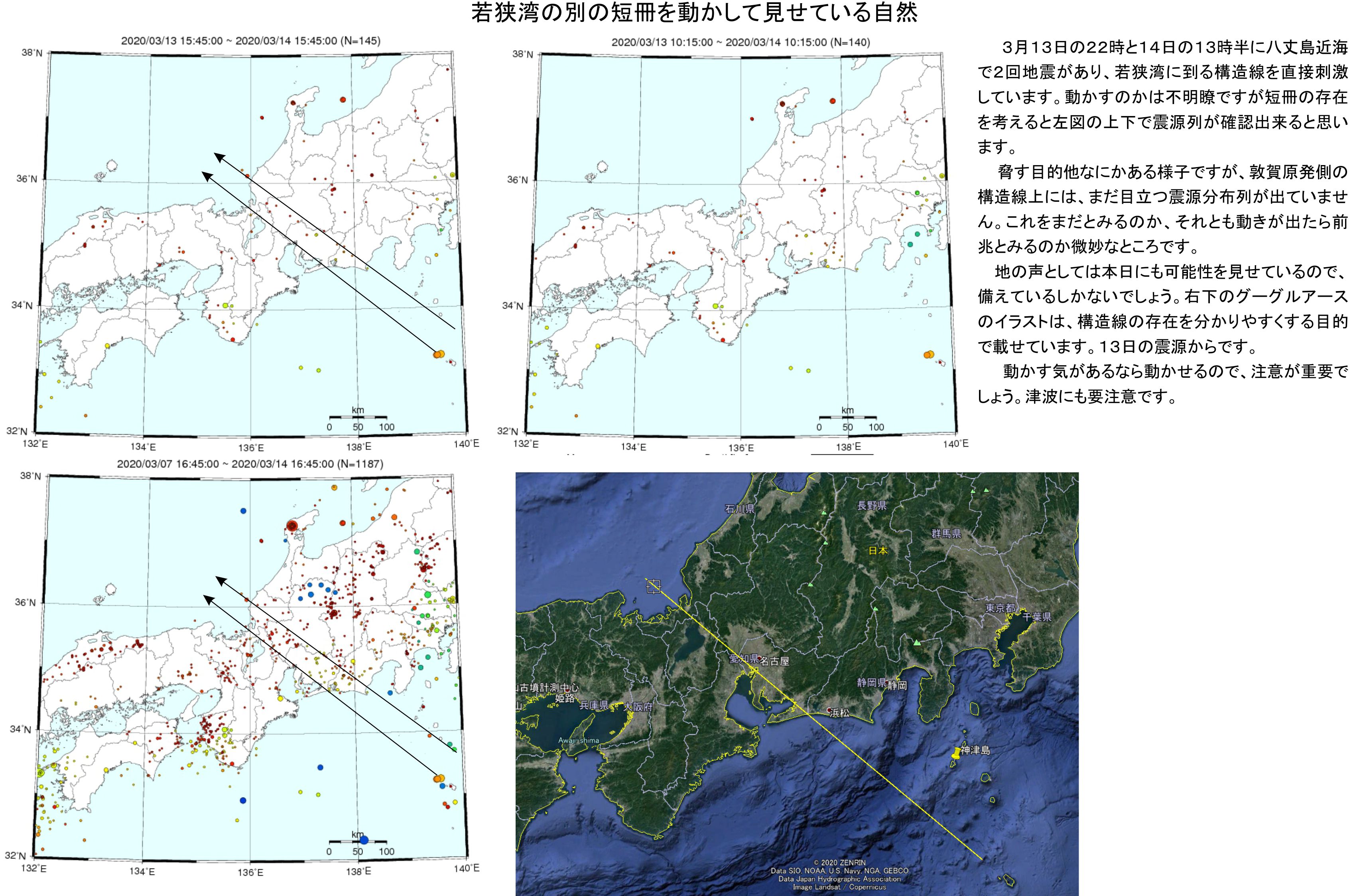 若狭湾の構造線上に地震が増えたので状況を調べていました。八丈島近海の2回の地震で若狭湾向けの構造線が大きく刺激されているので、改めての注意の喚起です。