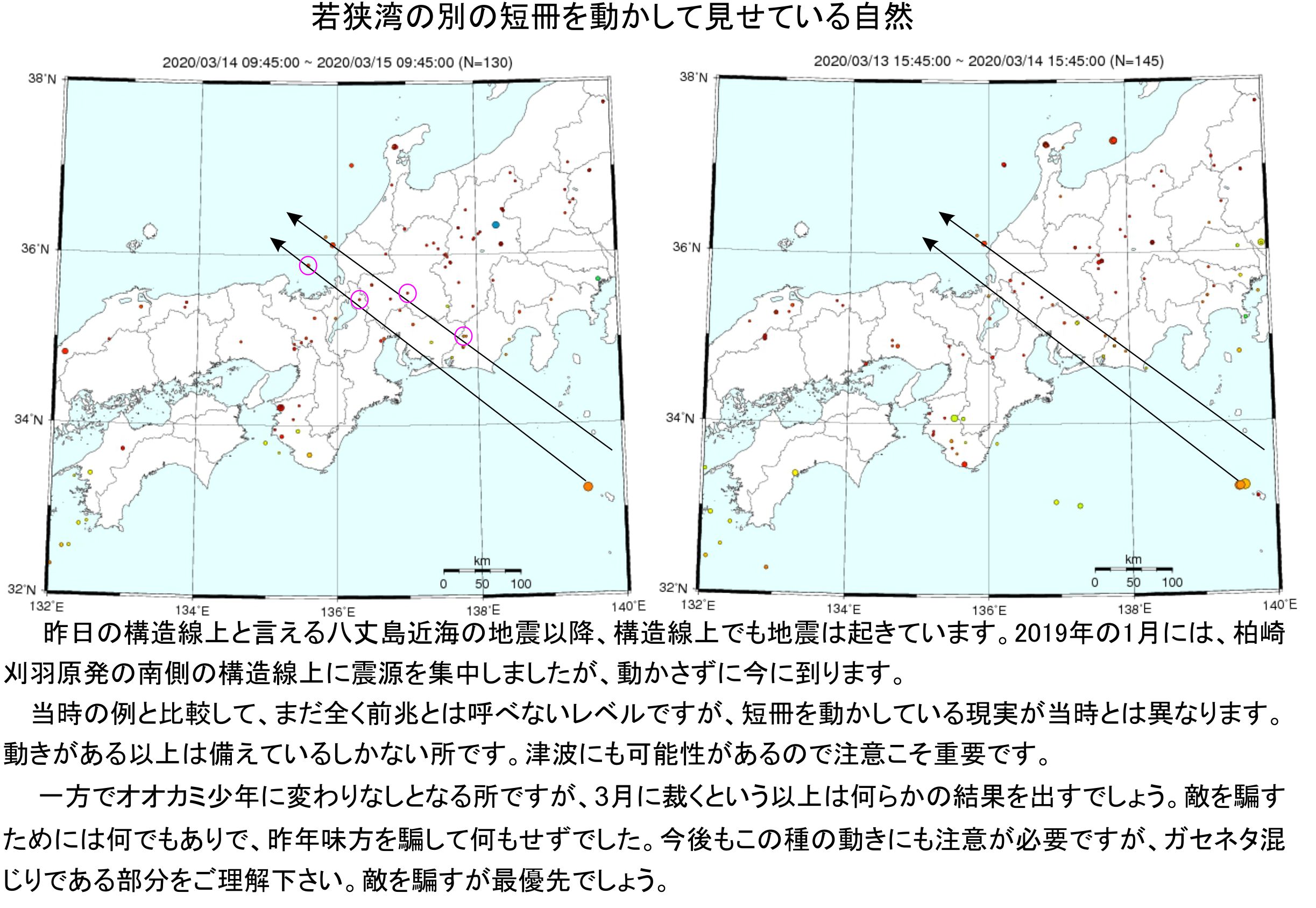 特に変化はありません。若狭湾への構造線上に地震が増えているのでイラストに載せておきます。2019年1月に柏崎刈羽原発の南側の構造線上に地震列を集めた時と比較すれば、まだまだの状況です。短冊を動かしているので注意を向けざるを得ないところでしょう。
