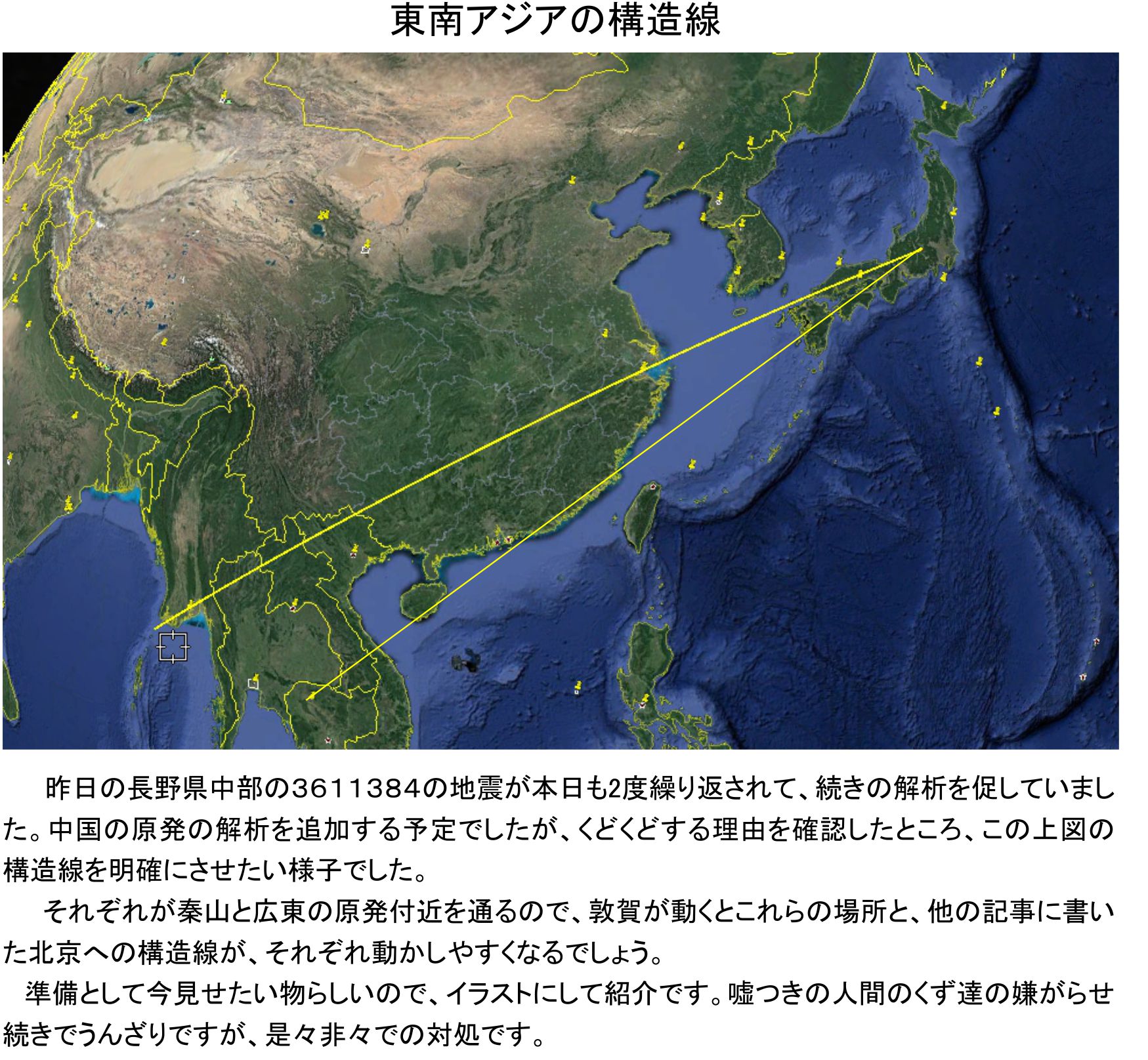 もう一つは阿蘇山火口の北側を通りアンコールワットです。こちらは中央構造線の動きに重なるので分かりにくいですが、前者が秦山、こちらが広東の原発付近に影響出来るという敵への意志表示でしょう。