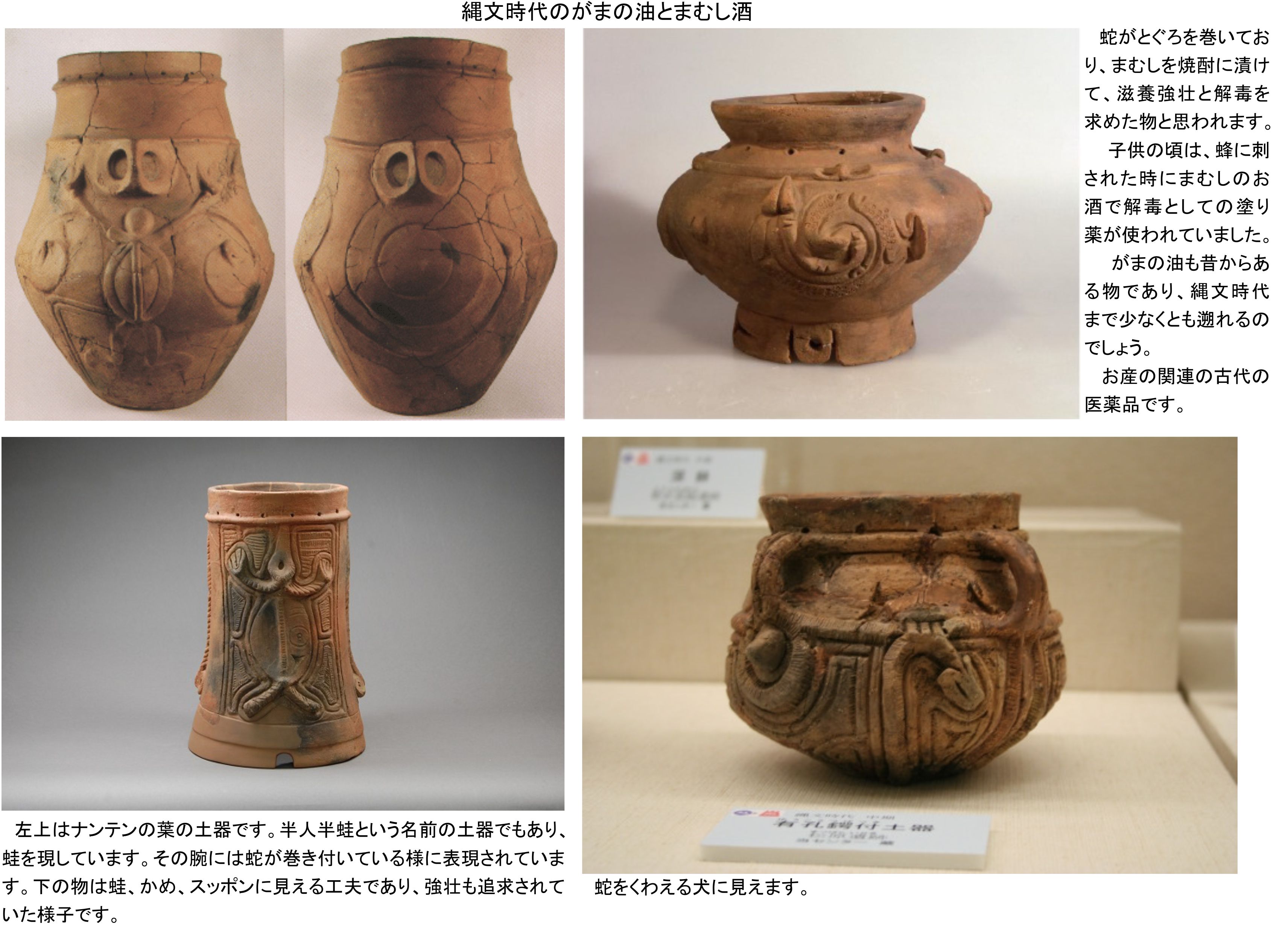 当時の薬草類と生薬類はこれに留まりません。続きが土偶と土器に表現されている生薬類です。以下の5つの物はお産に組み合わされて残されています。土偶でも配慮があり特別な5種類だと考えています。