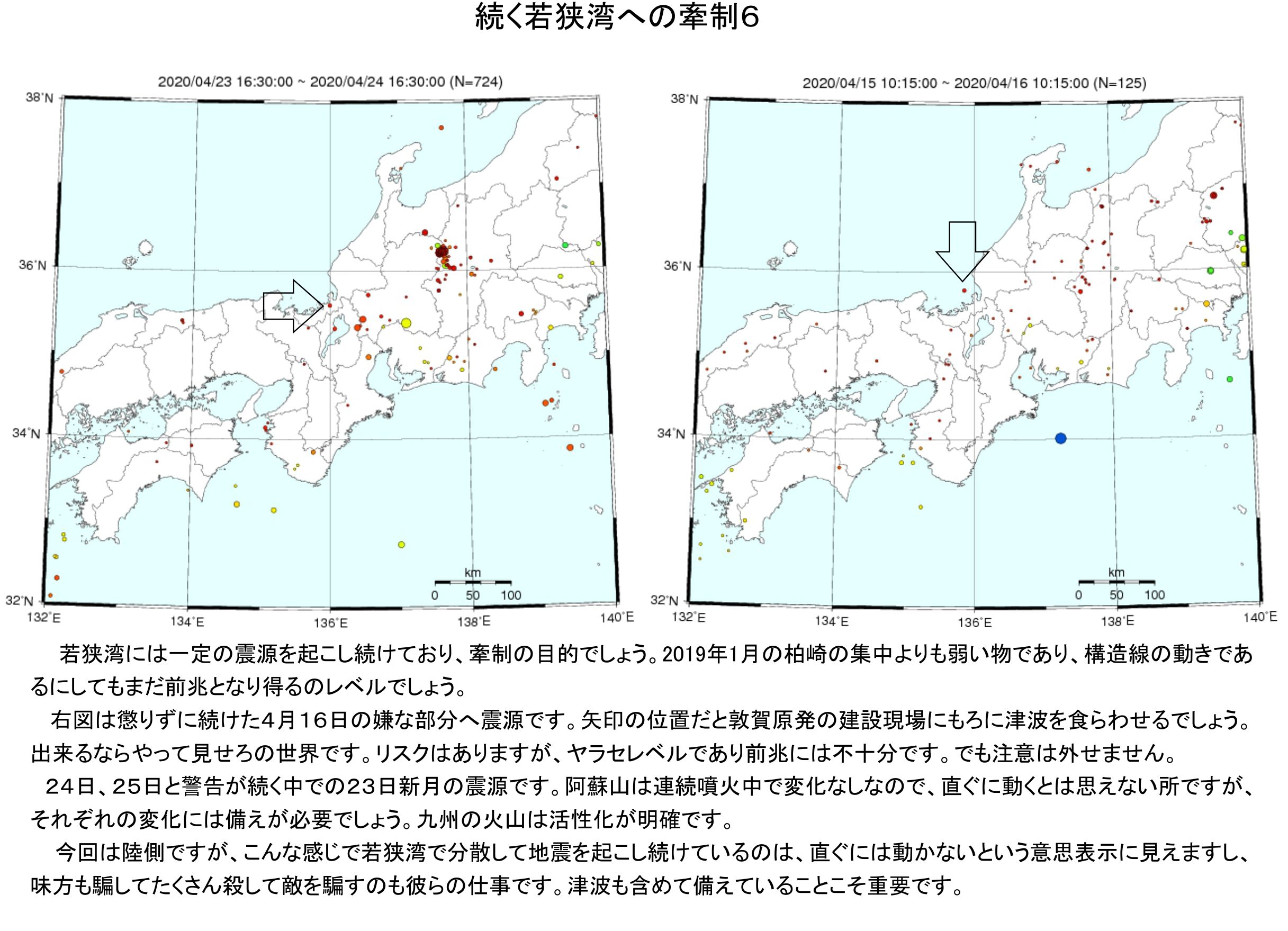 今回は陸側ですが、こんな感じで若狭湾で分散して地震を起こし続けているのは、直ぐには動かないという意思表示に見えますし、味方も騙してたくさん殺して敵を騙すのも彼らの仕事です。津波も含めて備えていることこそ重要です。