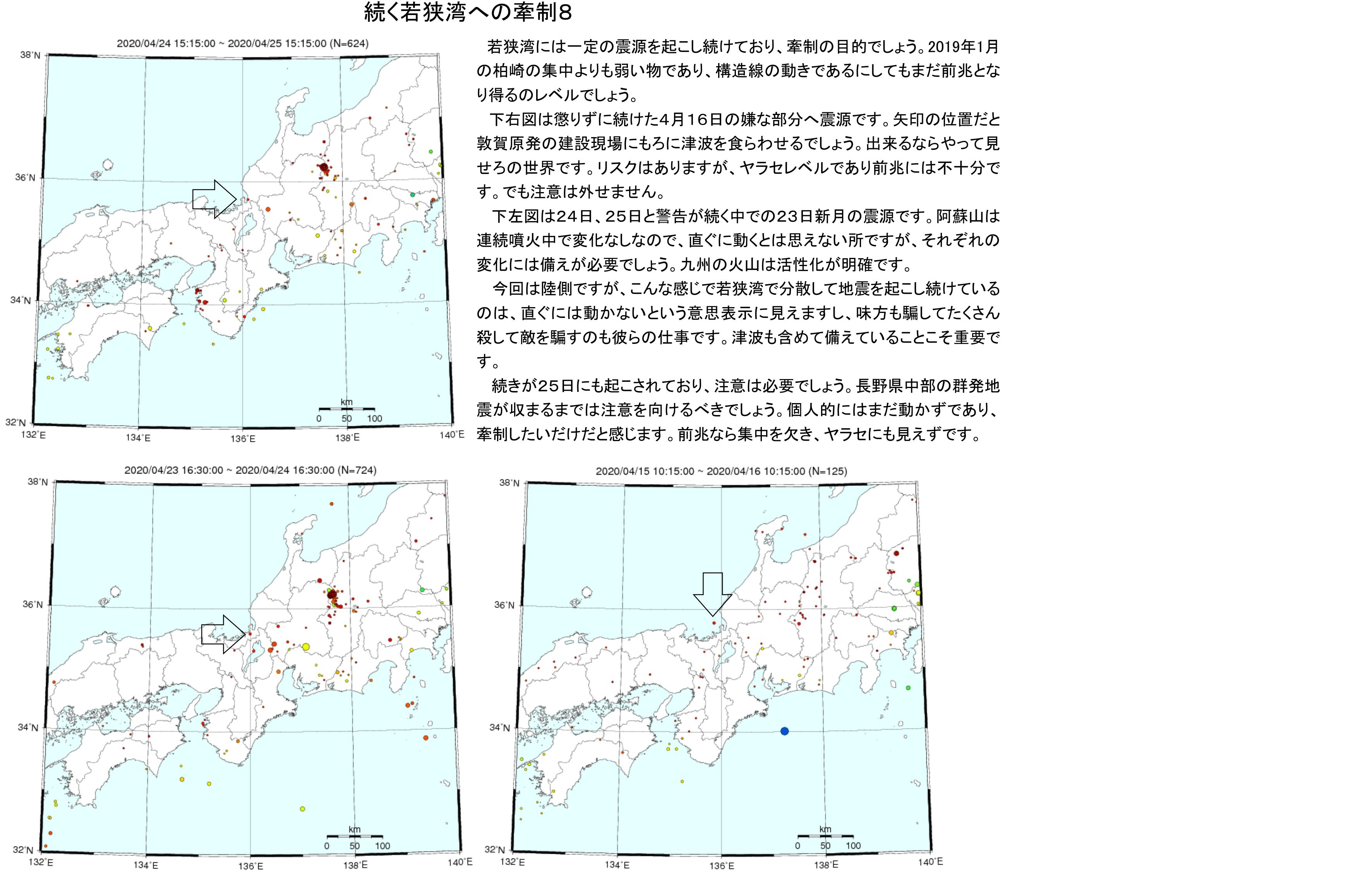 右図は懲りずに続けた4月16日の嫌な部分へ震源です。矢印の位置だと敦賀原発の建設現場にもろに津波を食らわせるでしょう。出来るならやって見せろの世界です。リスクはありますが、ヤラセレベルであり前兆には不十分です。でも注意は外せません。