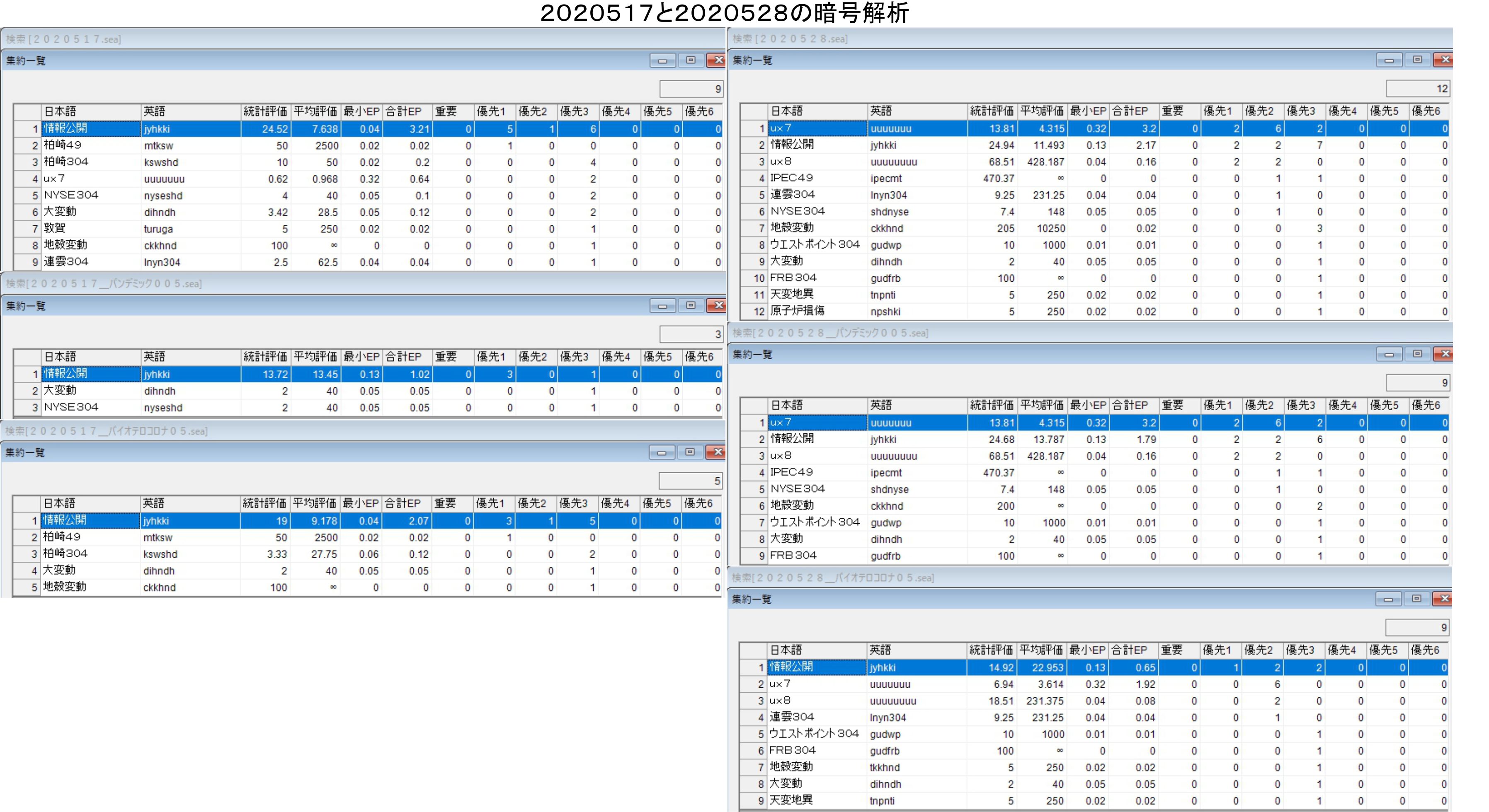 2020517と528では、どこで何が起きるかを明確にする事が難しそうであり、個別に見ると地殻変動が共通する言葉でしょう。これは一つの場所に何でも必要なことを組み込むのは、統計的に無理があるという現実に対応しています。ここで使っているデーターの総数は多くて200前後ですが、この数を増やせばより多くの情報になるのです。その結果は何でも出てきて統計操作の意図が分かりにくくなるのでした。