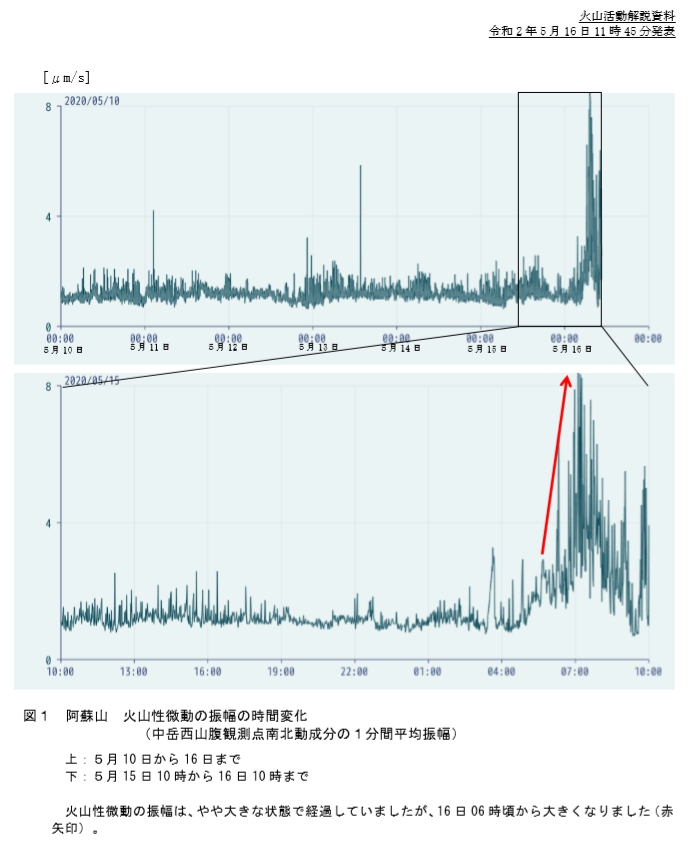 本日6時過ぎから阿蘇山の火山性微動が大きくなり、気象庁が噴火への警戒を呼びかけています。公表されたデーターをイラストに載せます。