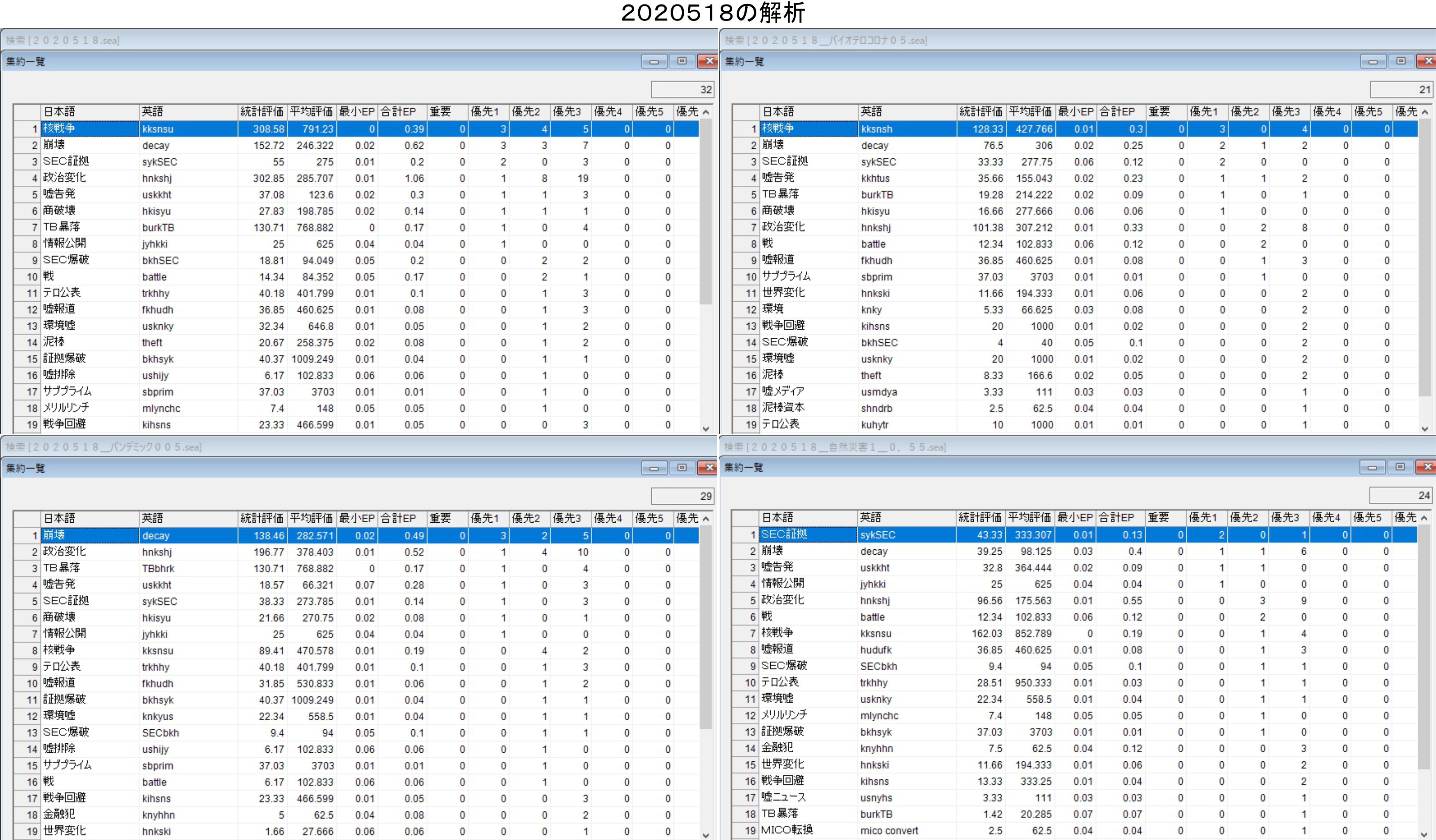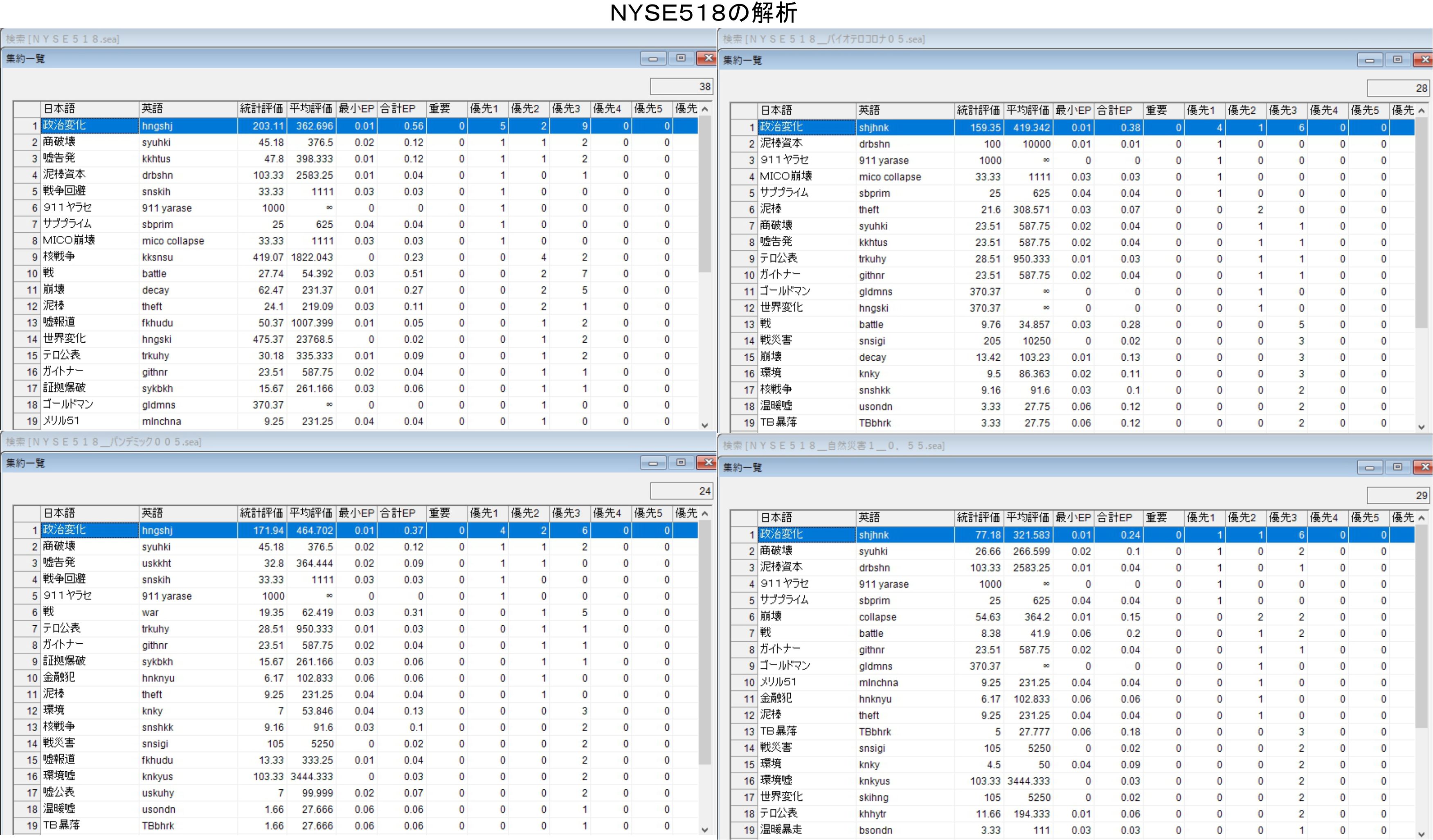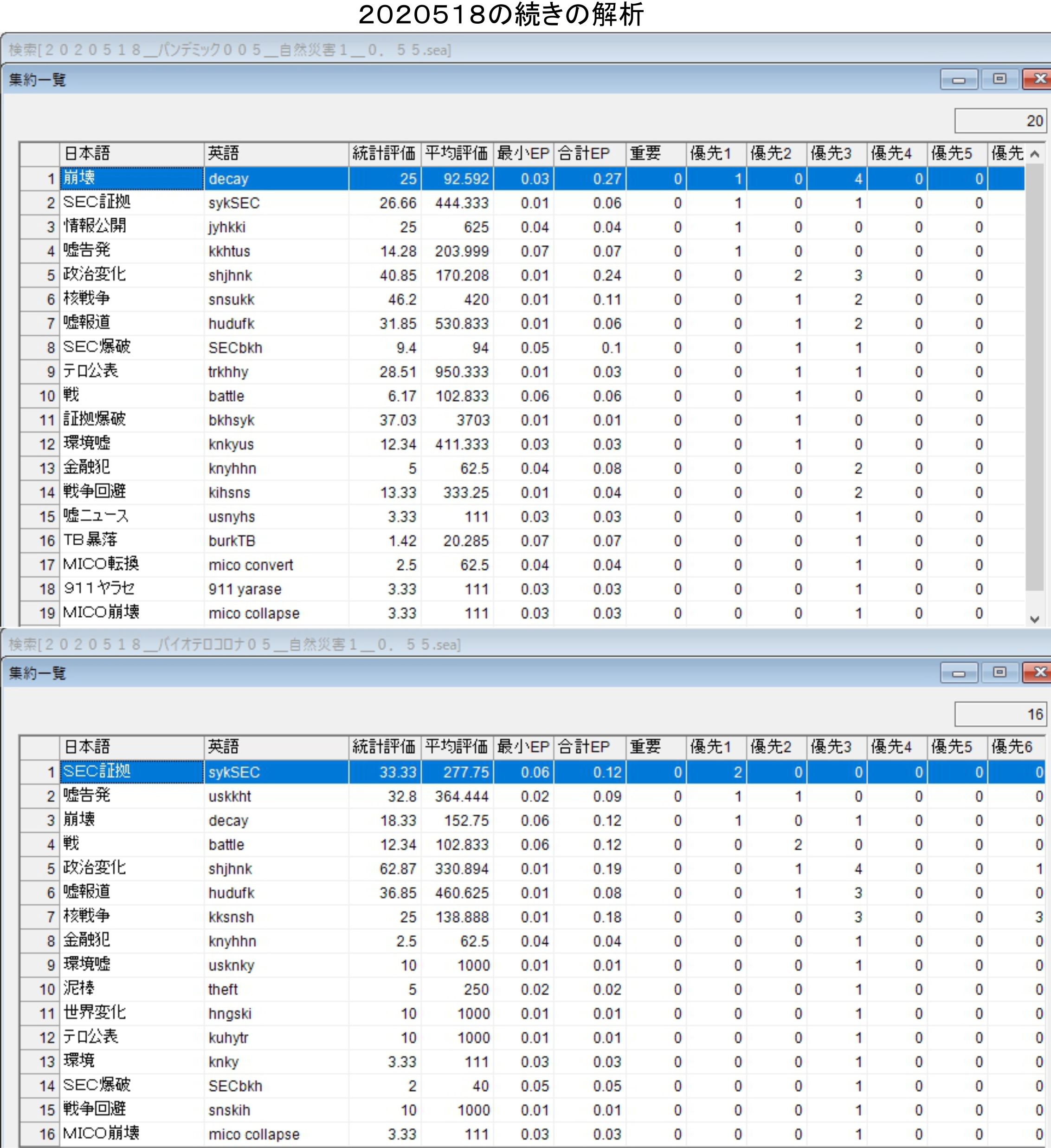 2020518とNYSE518の経済を評価した元データーを見ると、商破壊、崩壊、核戦争が気になる部分です。偽善の側はパンデミックを起こしてまずはNY市場の崩壊、続きで都市封鎖における商破壊、最後に核戦争という所でしょう。市場の崩壊と通商の崩壊、経済活動の大幅な低下はバイオテロのもたらす経済効果でもあります。これらが上位に出るように動かされていれば、偽善の側の望む未来でしょう。