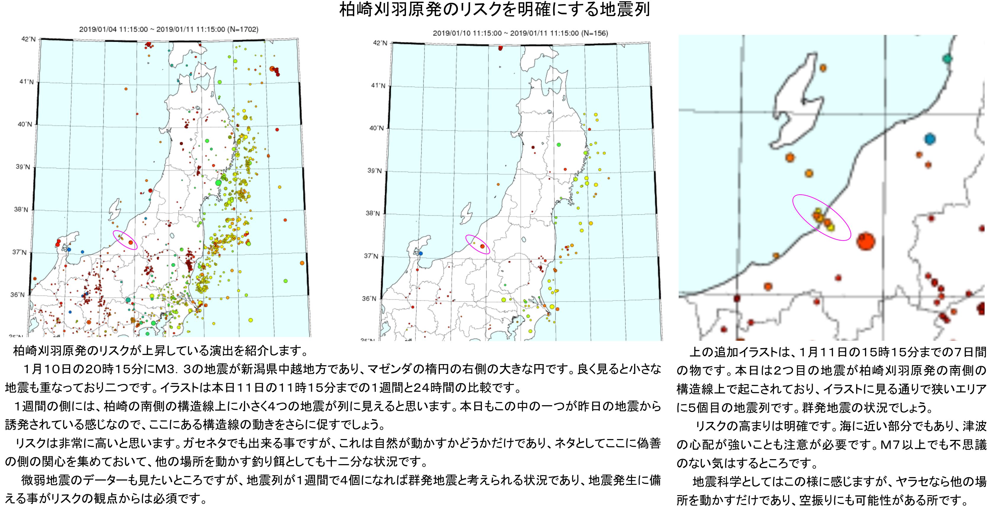 九州の動き全体を確認するために1ヶ月分の震源分布を見たのですが、博多の北西側にある地震列に驚かされていました。比較のために柏崎刈羽原発の南側の構造線上に2019年1月に起こされた地震列を、別イラストに載せておきます。