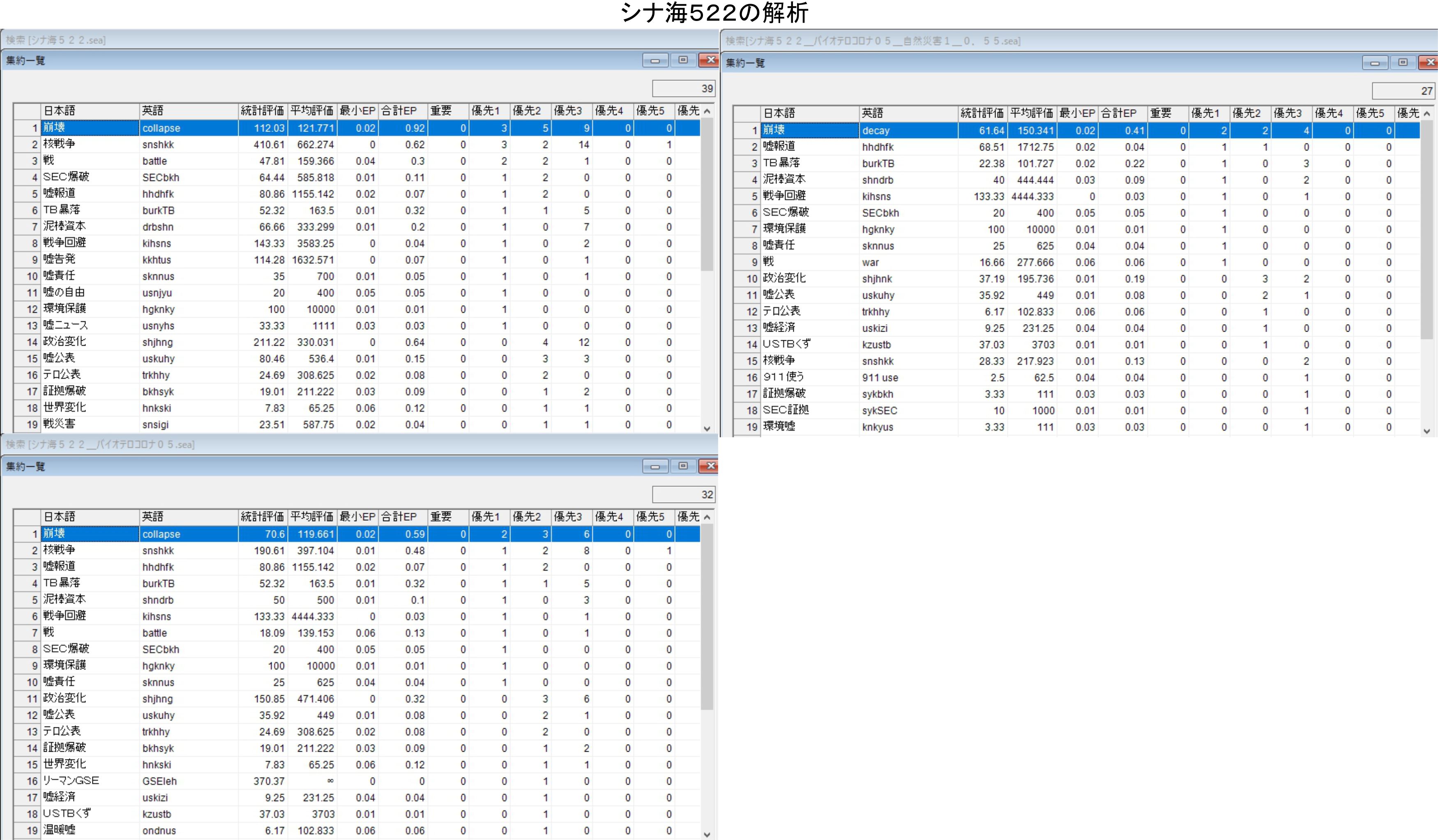 シナ海522ですが、東シナ海と南シナ海を同時に解析したいので中国の海としてシナ海としました。結果は自然災害をフィルター処理すると、核戦争が大きく順位を低下させるので、現実的な動きにも相応しいでしょう。いつどこが動くか次第でしょう。