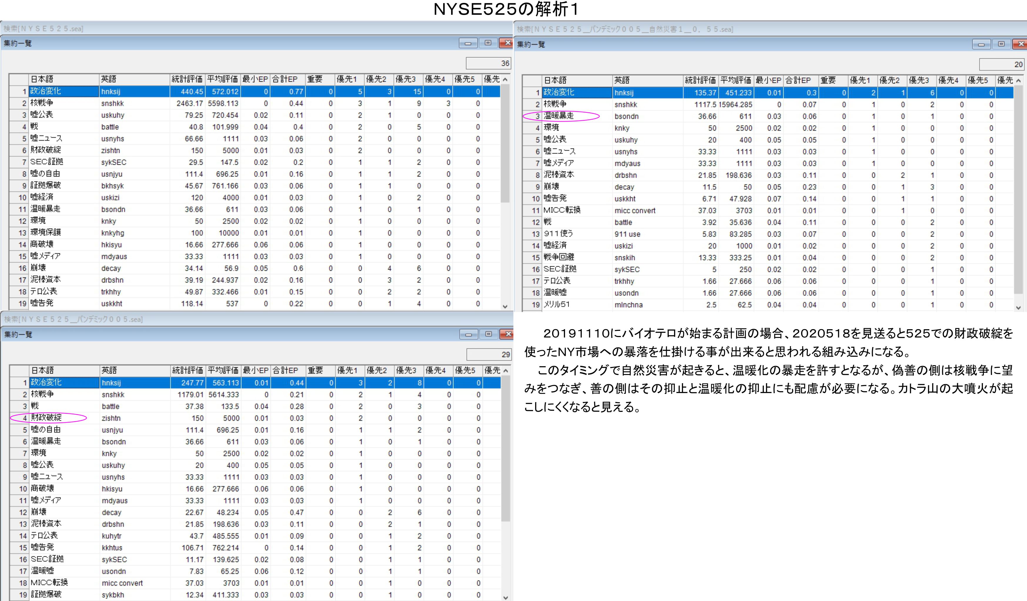 2019918から始まったバイオテロの場合でも、525のNY市場には暴落の危機が同様に存在するかも知れない結果でした。財政破綻が明確になるとこの動きになりやすいと思われます。
