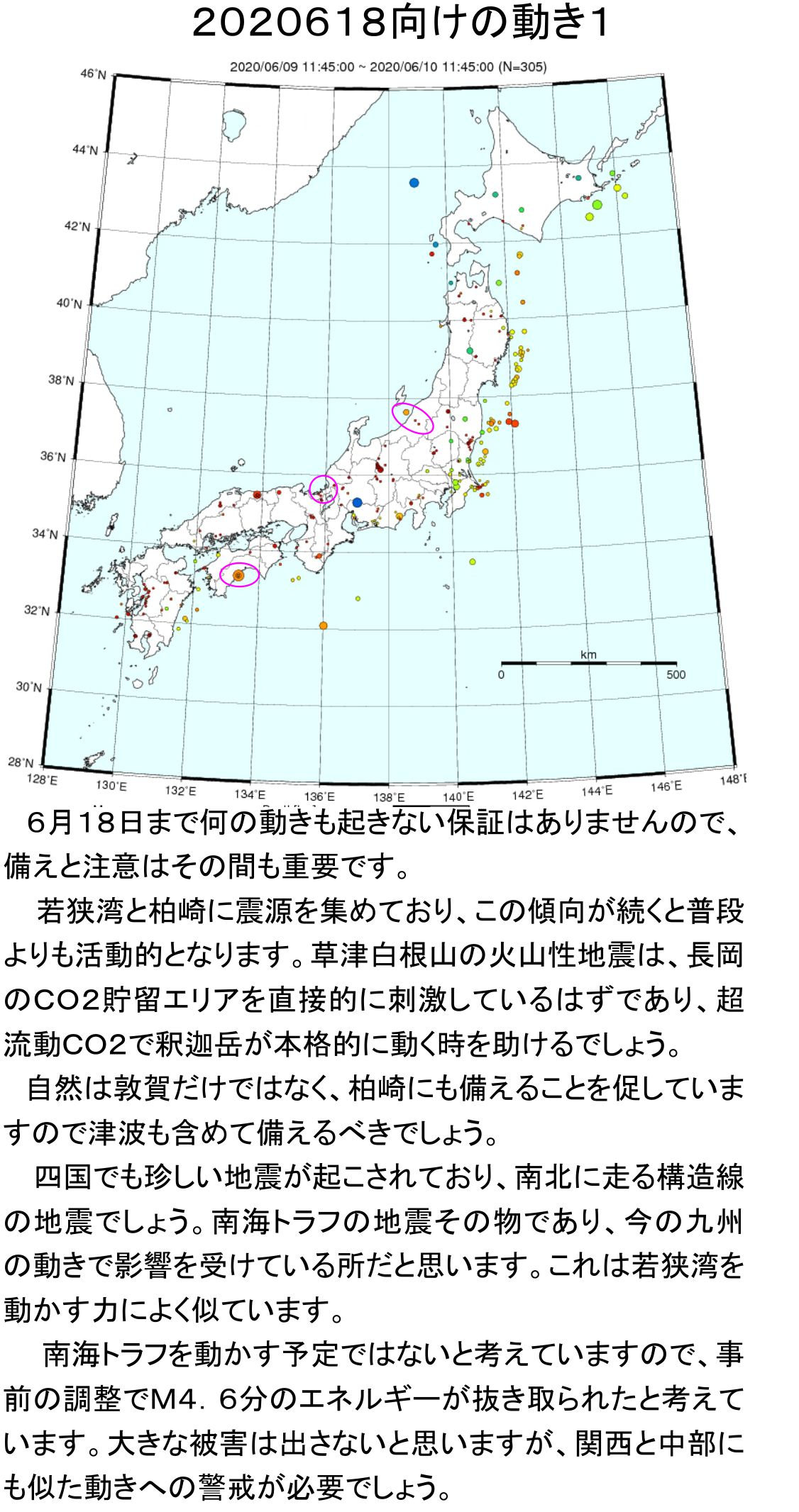 自然は6月18日の北朝鮮のミサイル発射と、これに前後する中共の動きに警告を出しています。米中の衝突が明確になったところで、安倍政権が軍産議会複合体の言いなりとして尖閣列島での紛争に進む姿が明確になっています。暗号解析で見てもこの先は善の側の望んだ流れに沿った動きであり、軍産議会複合体と中国共産党は香港とこの衝突に追い込まれて自然災害がそれを止めるという演出が、これから数ヶ月繰り返される様に感じられています。備えと注意は油断なくお願い致します。