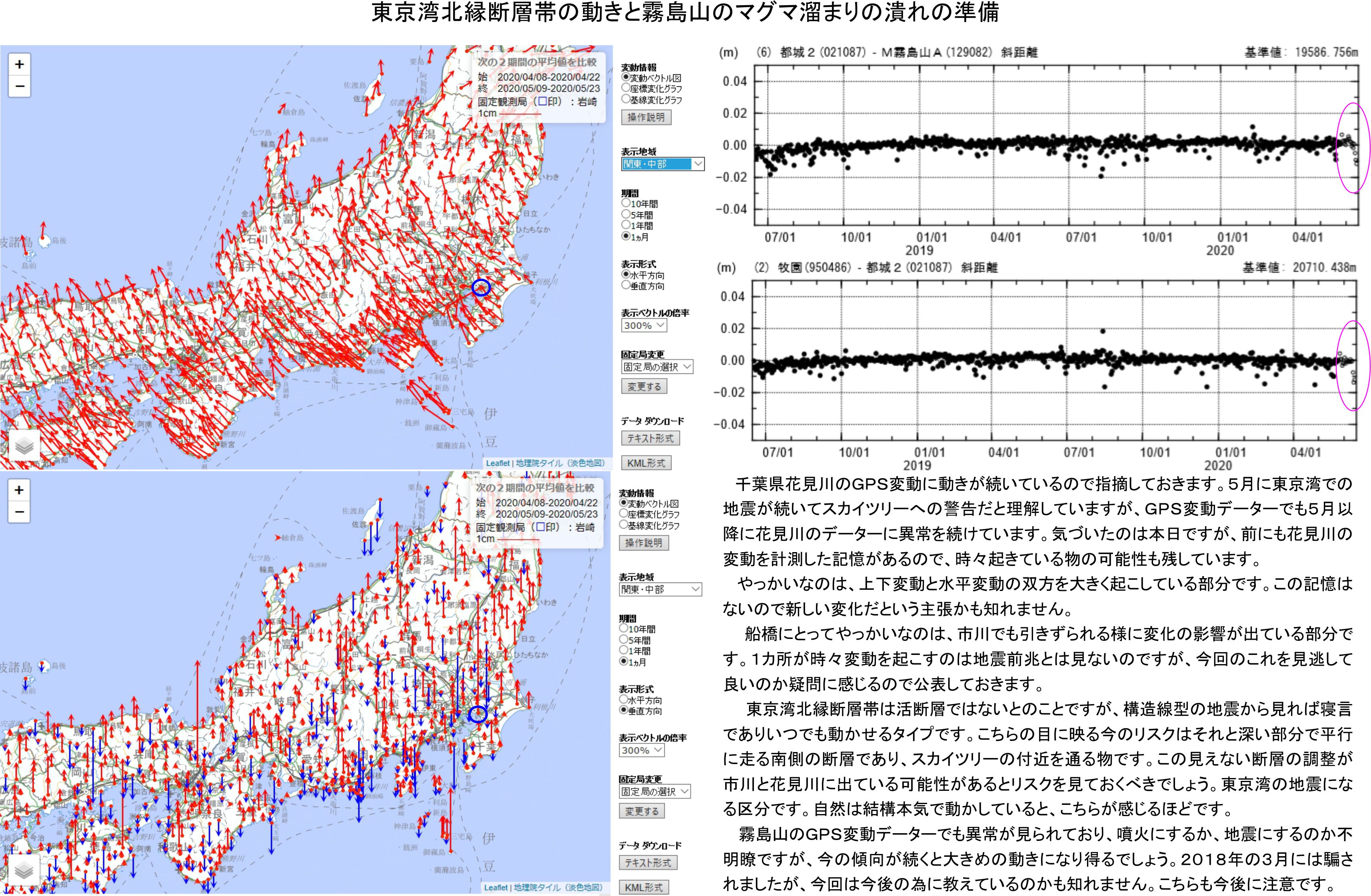 霧島山のGPS変動データーでも異常が見られており、噴火にするか、地震にするのか不明瞭ですが、今の傾向が続くと大きめの動きになり得るでしょう。2018年の3月には騙されましたが、今回は今後の為に教えているのかも知れません。こちらも今後に注意です。