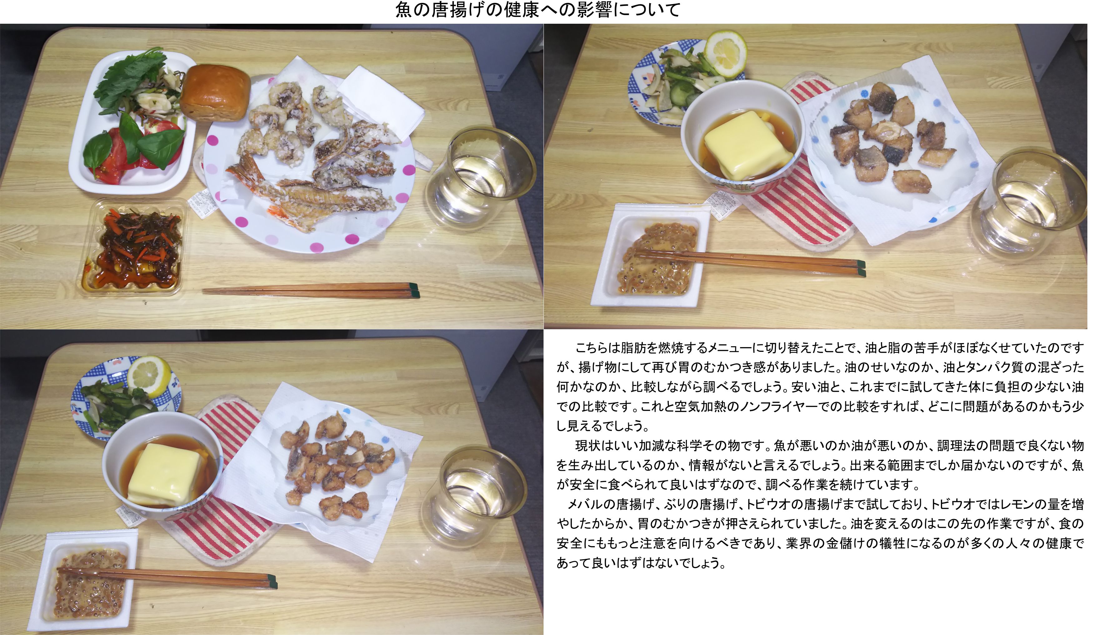 推奨が書かれていて、ノンフライヤーという空気の温度で唐揚げを作る機械があるそうです。これだと脂の影響は減らせるでしょう。今は買えないのですが、資金繰りが改善すれば比較可能に変わるので、今の時点で魚について比較データーを集め始めたところです。