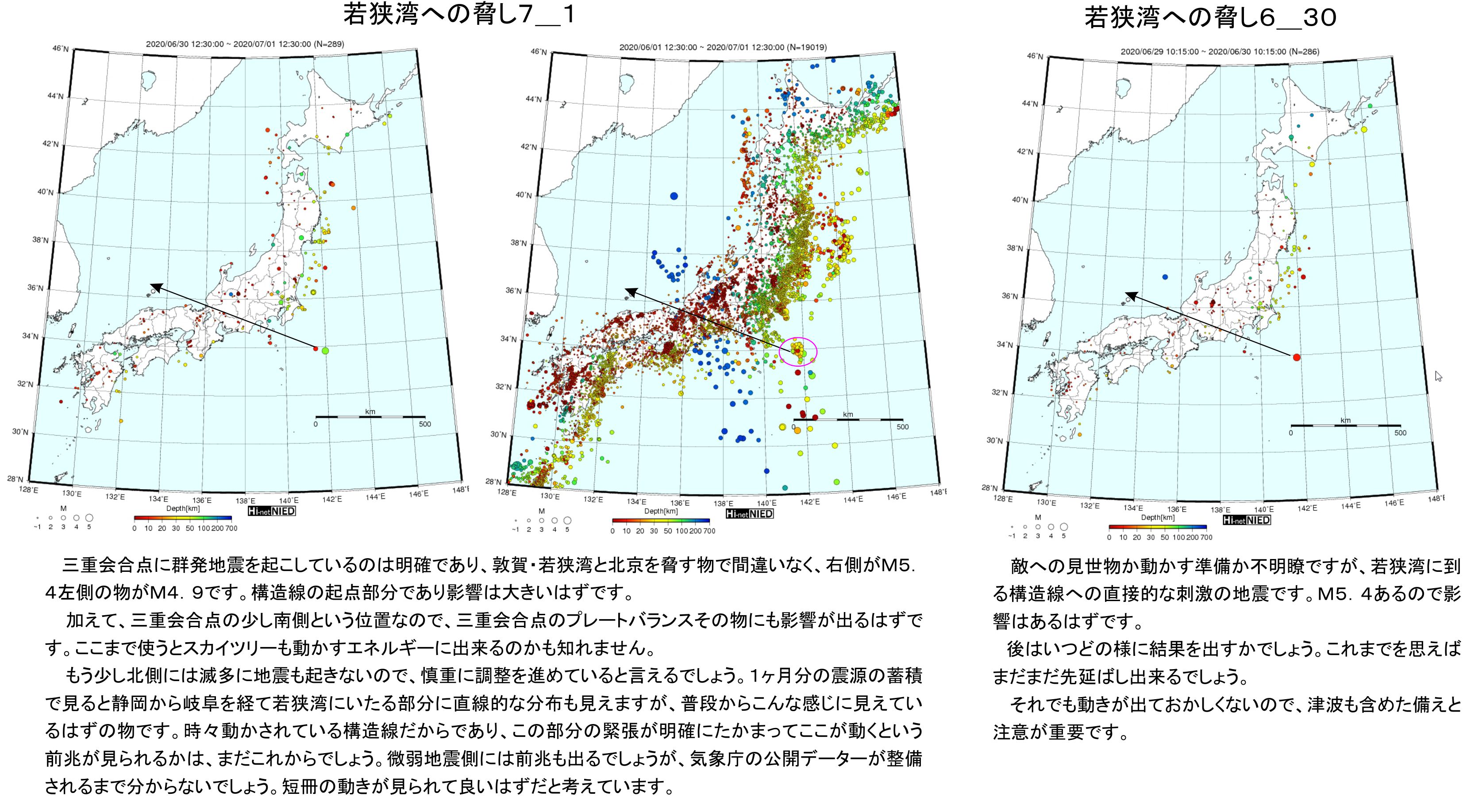 一昨日の三重会合点の地震ですが、その後にM4.9を続けていますし、以前の分も含めてここに群発地震を起こしています。北京に見せる物だと思われ、7月4~7日の何かを外すまたは当てる物だと思っています。