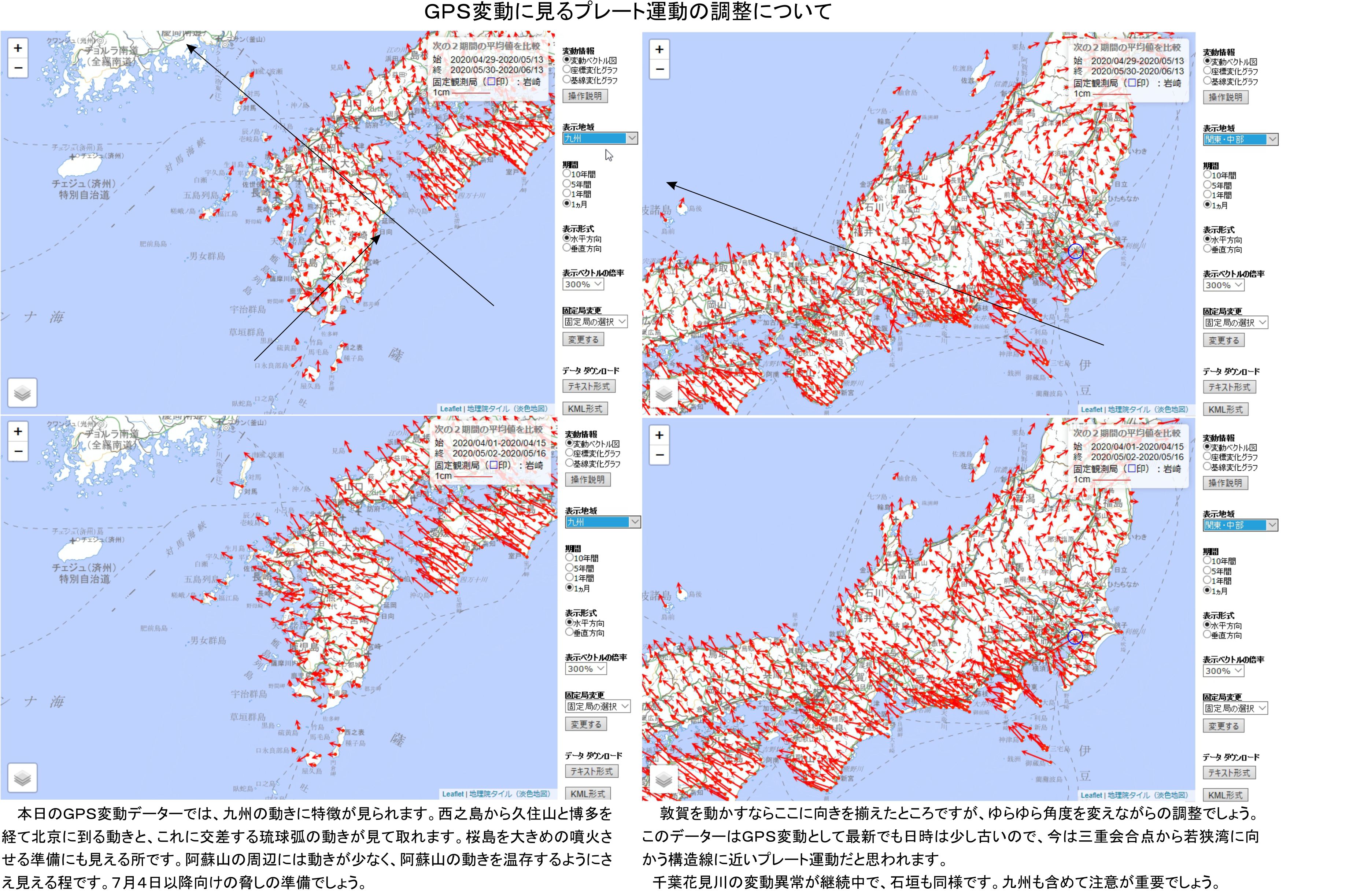 本日のGPS変動データーでは、九州の動きに特徴が見られます。西之島から久住山と博多を経て北京に到る動きと、これに交差する琉球弧の動きが見て取れます。桜島を大きめの噴火させる準備にも見える所です。阿蘇山の周辺には動きが少なく、阿蘇山の動きを温存するようにさえ見える程です。7月4日以降向けの脅しの準備でしょう。エネルギーが通る久住山から博多にも注意をお願いします。
