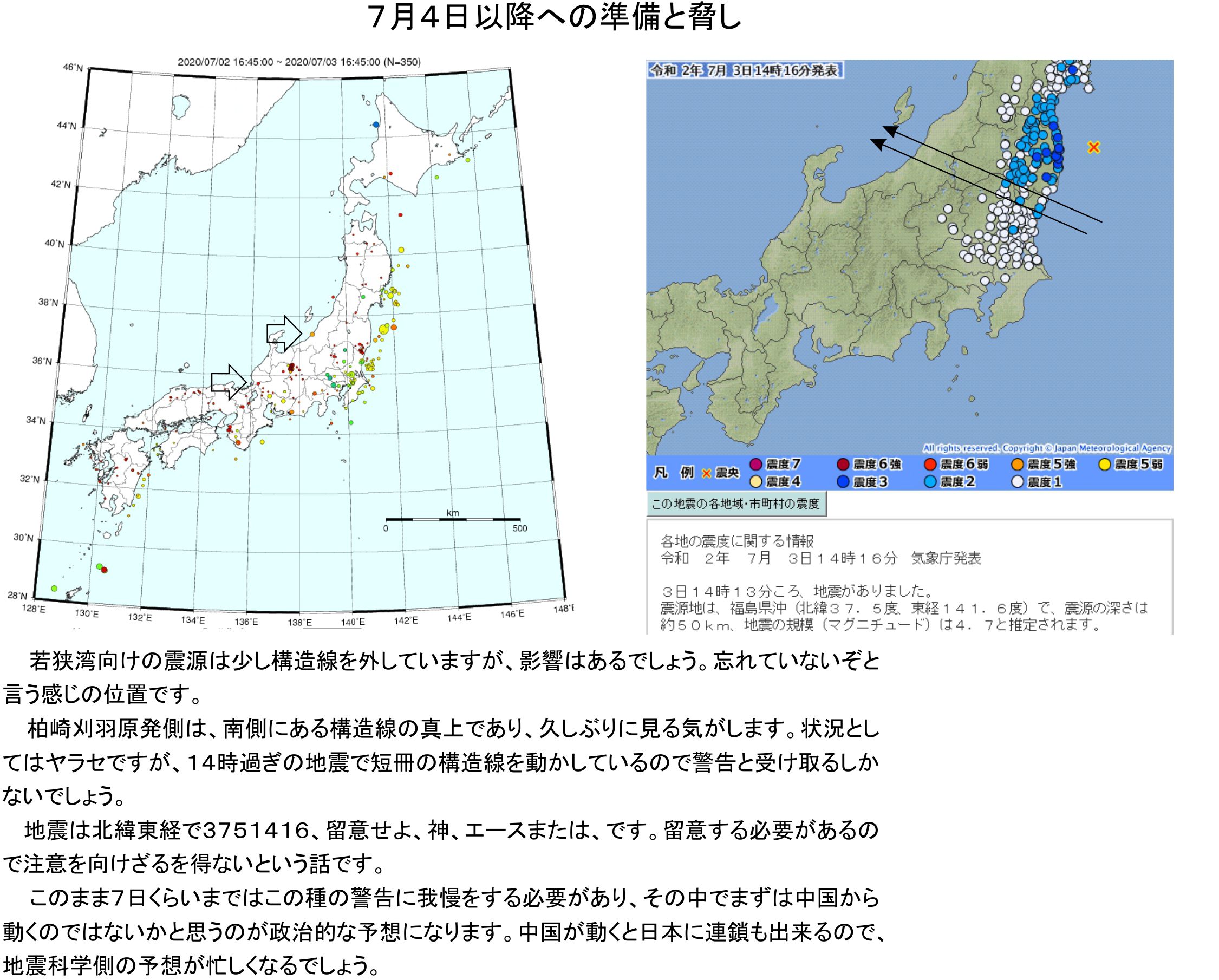 1年前の地震で米国を脅しており、今も米軍に動くなの状況であり、コップの森を動かすぞの脅しです。これで明日までの対峙を無事に済ませると、続きで動き始める北朝鮮や尖閣列島への中共の動きに合わせての、自然の動きかと思えます。結局7月4日から7日までも外す動きでしょう。米軍の動きを外す続きでやっと、止まれなくなった者が未来を掛けての勝負でしょう。