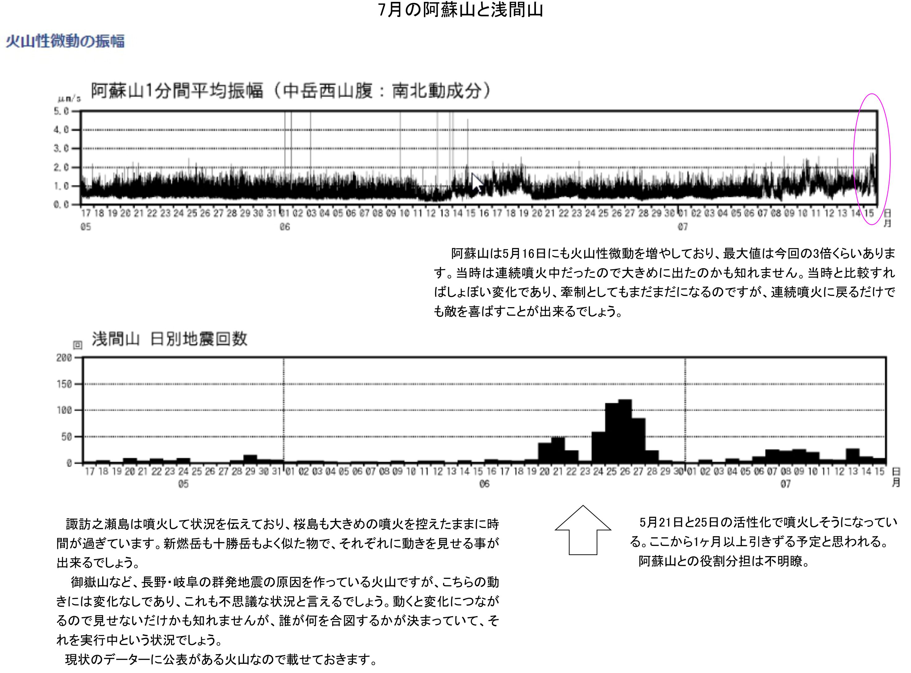 7月16日 諏訪之瀬島が噴火し、米中の軍事衝突リスクを伝え、阿蘇山も再び火山性微動を起こして、敵に警告している。