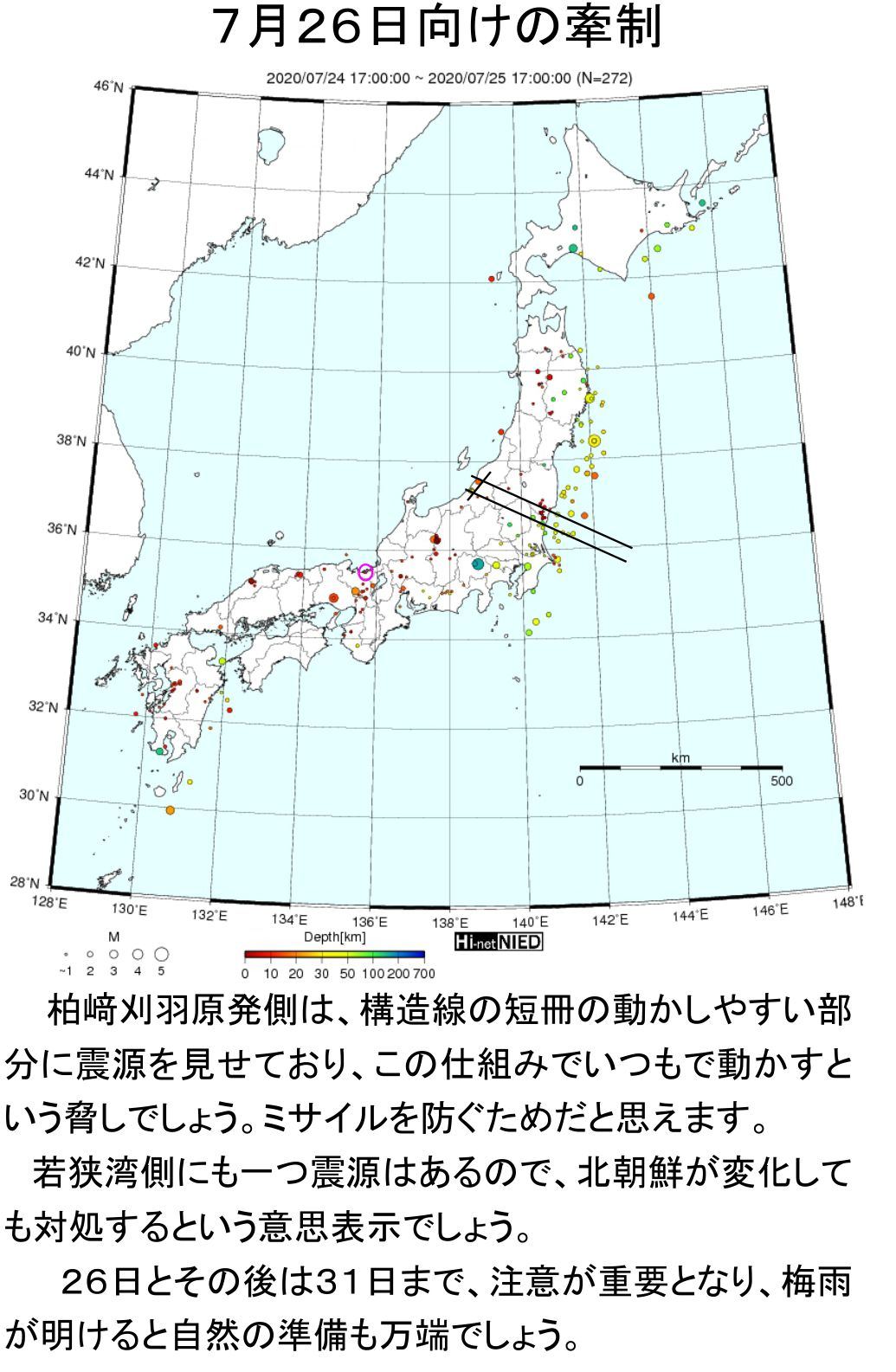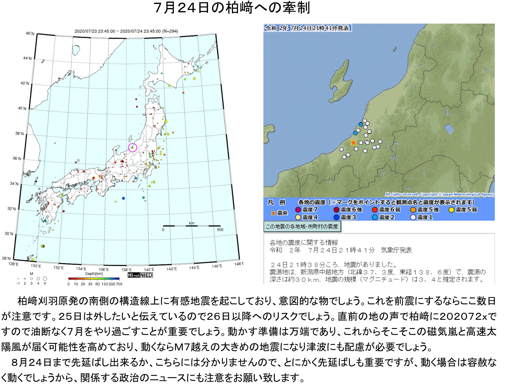柏﨑刈羽原発の南側の構造線上に有感地震を起こしており、意図的な物でしょう。これを前震にするならここ数日が注意です。25日は外したいと伝えているので26日以降へのリスクでしょう。直前の地の声で柏﨑に202072xですので油断なく7月をやり過ごすことが重要でしょう。動かす準備は万端であり、これからそこそこの磁気嵐と高速太陽風が届く可能性を高めており、動くならM7越えの大きめの地震になり津波にも配慮が必要でしょう。