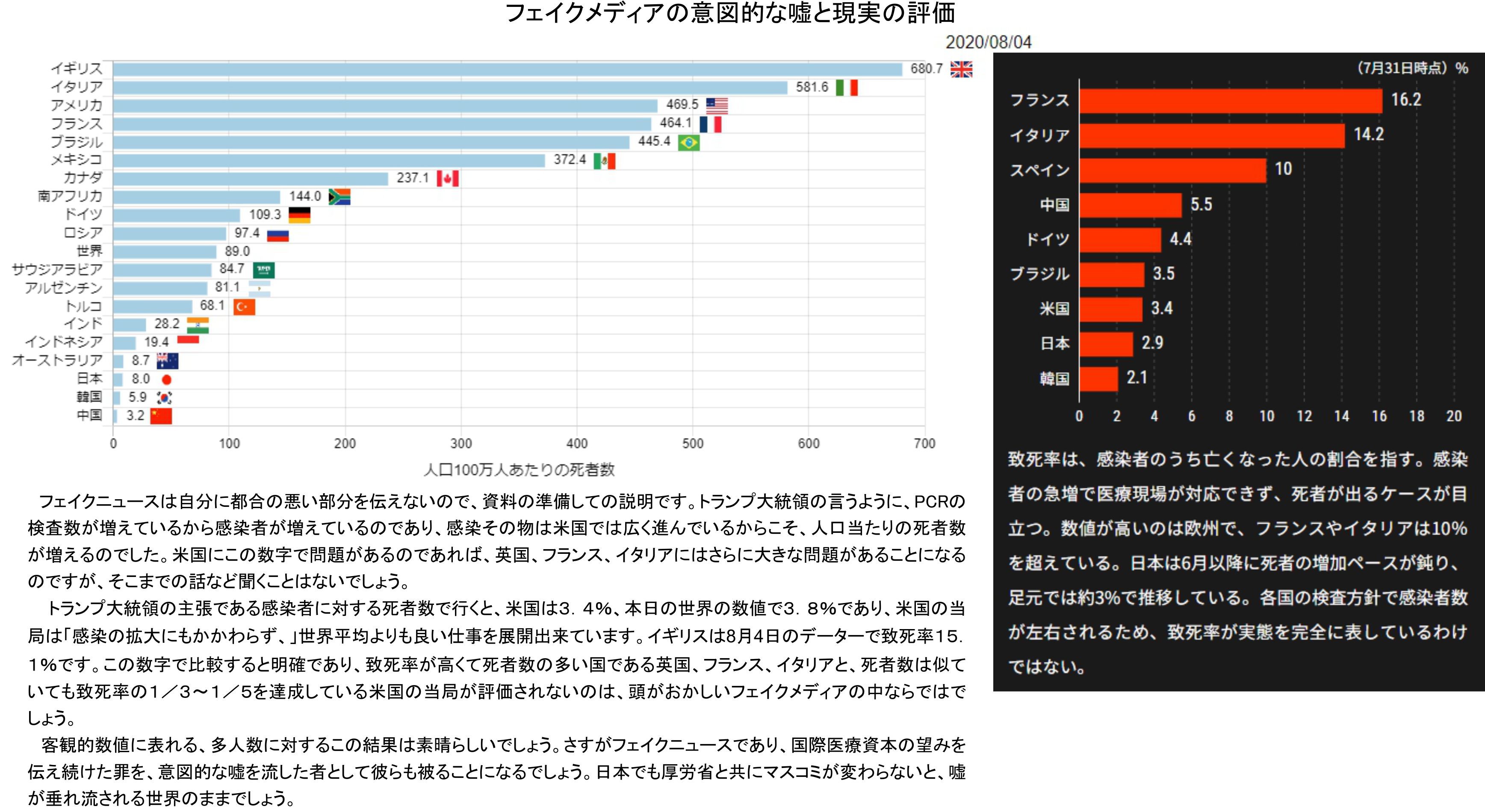 トランプ大統領の主張である感染者に対する死者数で行くと、米国は3.4%、本日の世界の数値で3.8%であり、米国の当局は「感染の拡大にもかかわらず、」世界平均よりも良い仕事を展開出来ています。イギリスは8月4日のデーターで致死率15.1%です。この数字で比較すると明確であり、致死率が高くて死者数の多い国である英国、フランス、イタリアと、死者数は似ていても致死率の1/3~1/5を達成している米国の当局が評価されないのは、頭がおかしいフェイクメディアの中ならではでしょう。