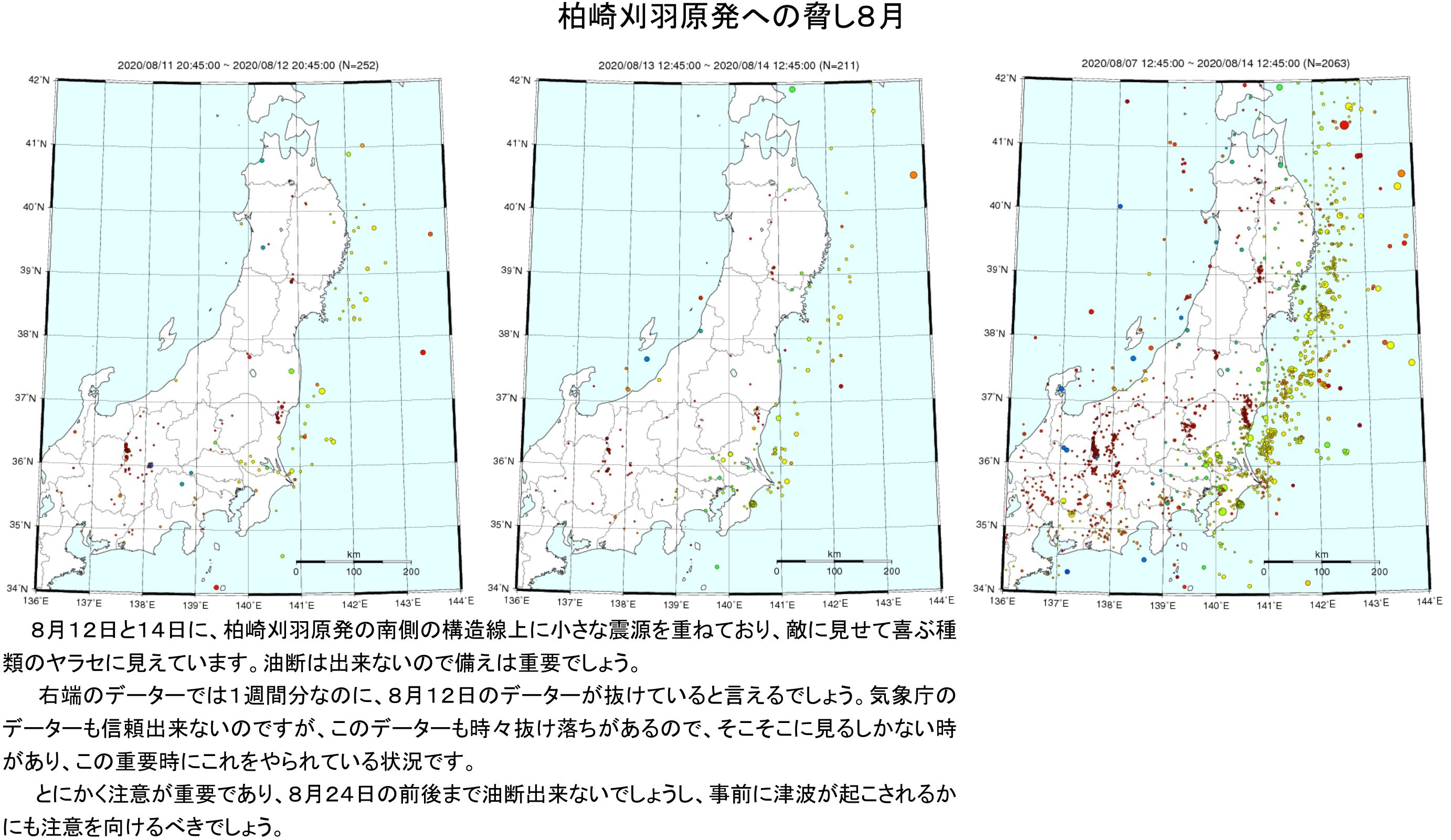 柏崎刈羽原発の構造線上には、まだ懲りずに小さな震源を追加しており、ここを脅しに使っている部分は明確でしょう。昨日の364と359の続きがどうなるかですが、すぐに動かざるを得ないリスクなら動かすでしょうし、8月21日か24日の前後まで先延ばしすることは容易いので、このタイミングなのか、変化の時を待つようです。