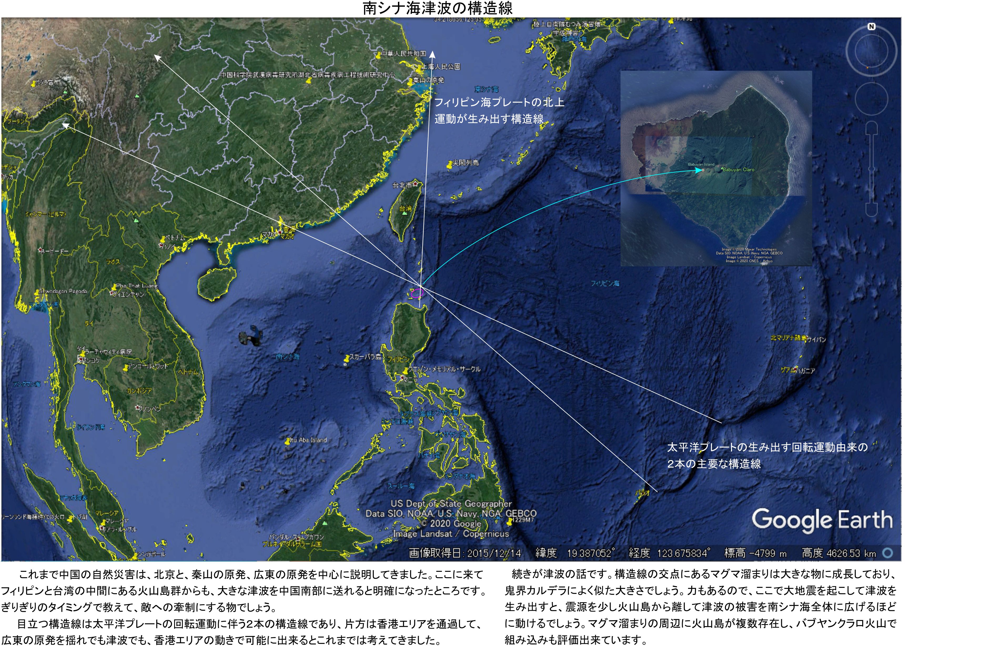これまで中国の自然災害は、北京と、秦山の原発、広東の原発を中心に説明してきました。ここに来てフィリピンと台湾の中間にある火山島群からも、大きな津波を中国南部に送れると明確になったところです。ぎりぎりのタイミングで教えて、敵への牽制にする物でしょう。