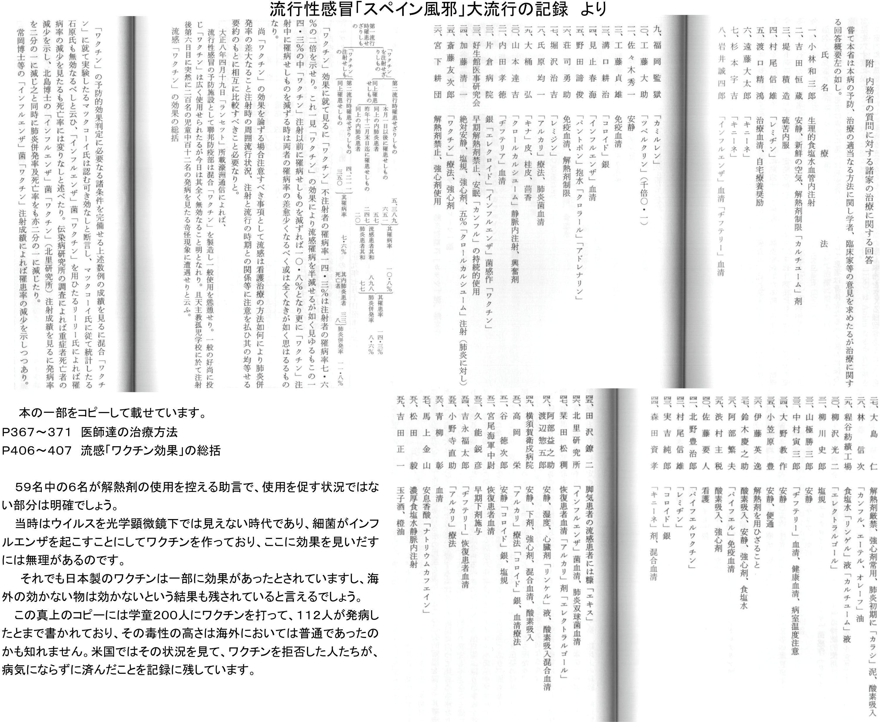 この療法はスペイン風邪の時にも使われており、一定の効果はある物です。ペンタゴンワクチン風邪は肺炎で死者を増やしましたが、人間の免疫作用の暴走であり、これを止める治療に効果があったのでした。抗体の作成を促せる場合に良いのかと思います。新型コロナウイルスの始めの頃に書いた記事に、スペイン風邪当時の記録本のコピーがあるので載せておきます。