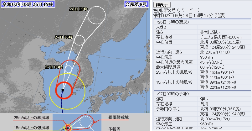 中国側の演習は、台風が通過するとなれば縮小せざるを得ないでしょうから、偶発的な紛争開始のリスクは低下するでしょう。どこまで双方が意地を張るかも影響しますが、自然は大きく台風を発達させて答えるでしょうから、強い勢力が維持されて黄海、渤海を通過して行くのでしょう。