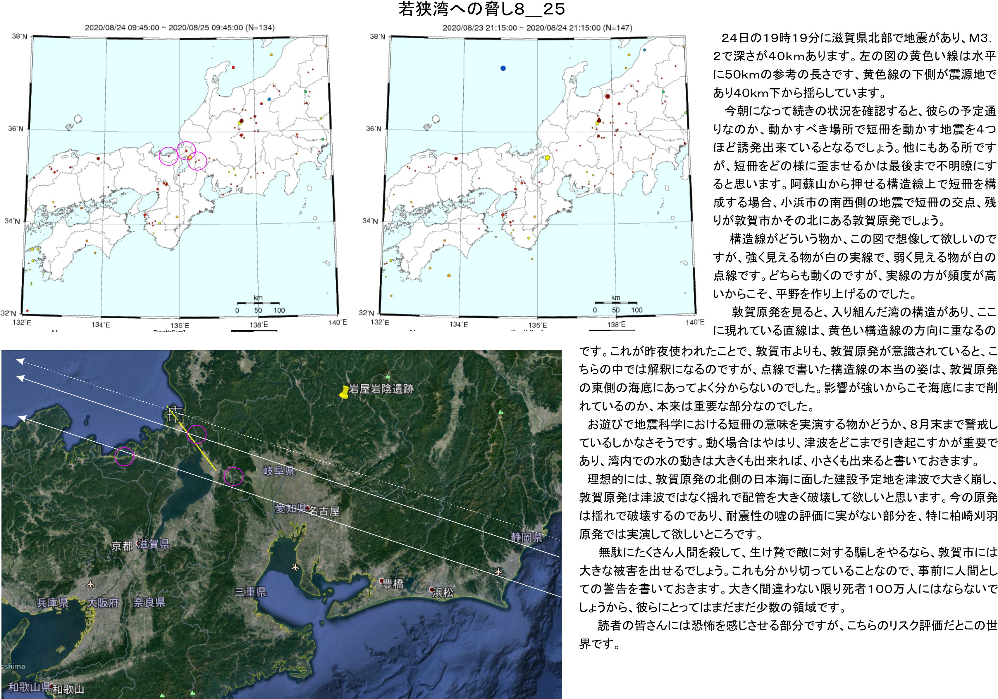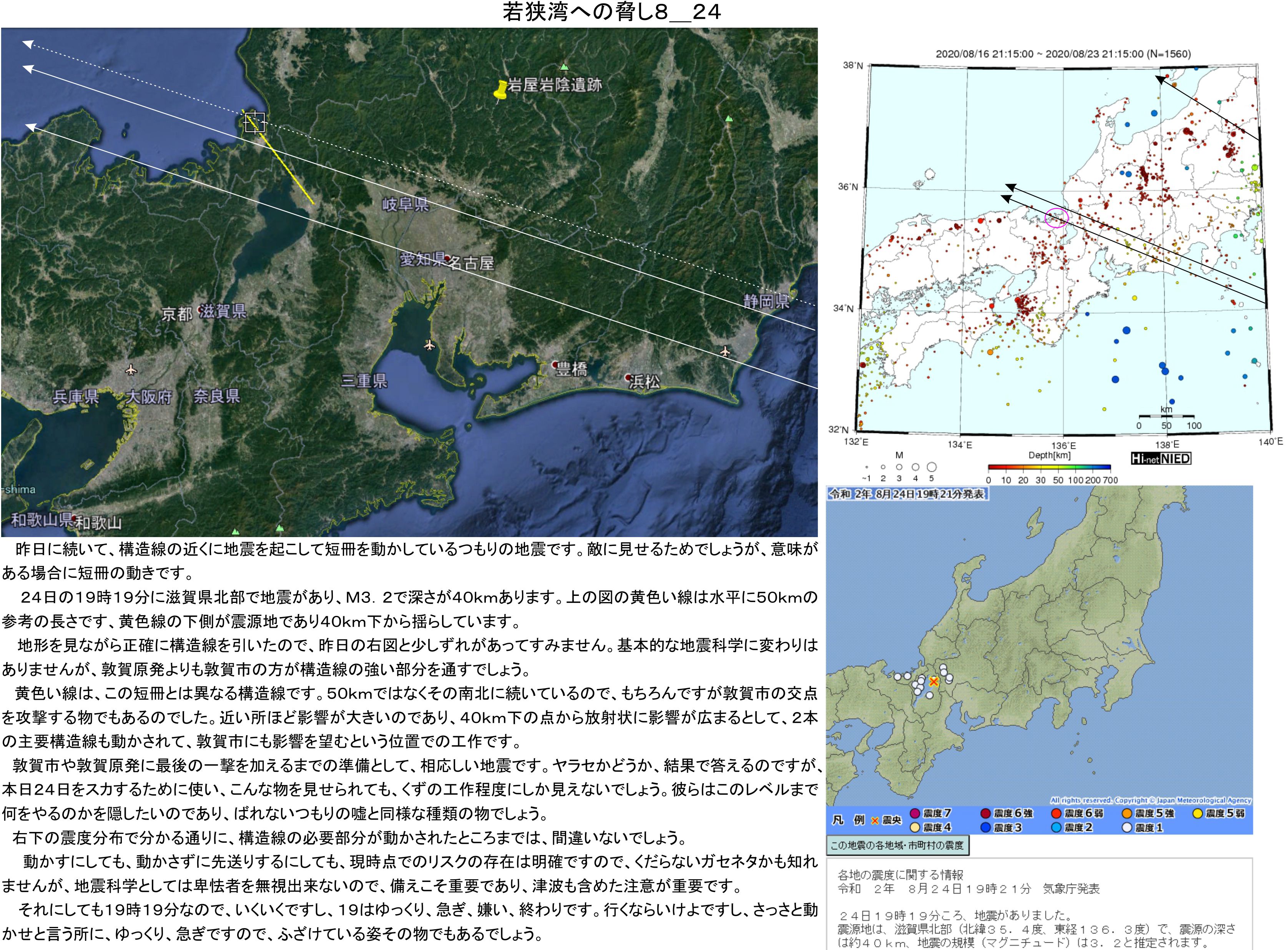24日の19時19分に滋賀県北部で地震があり、M3.2で深さが40kmあります。左の図の黄色い線は水平に50kmの参考の長さです、黄色線の下側が震源地であり40km下から揺らしています。