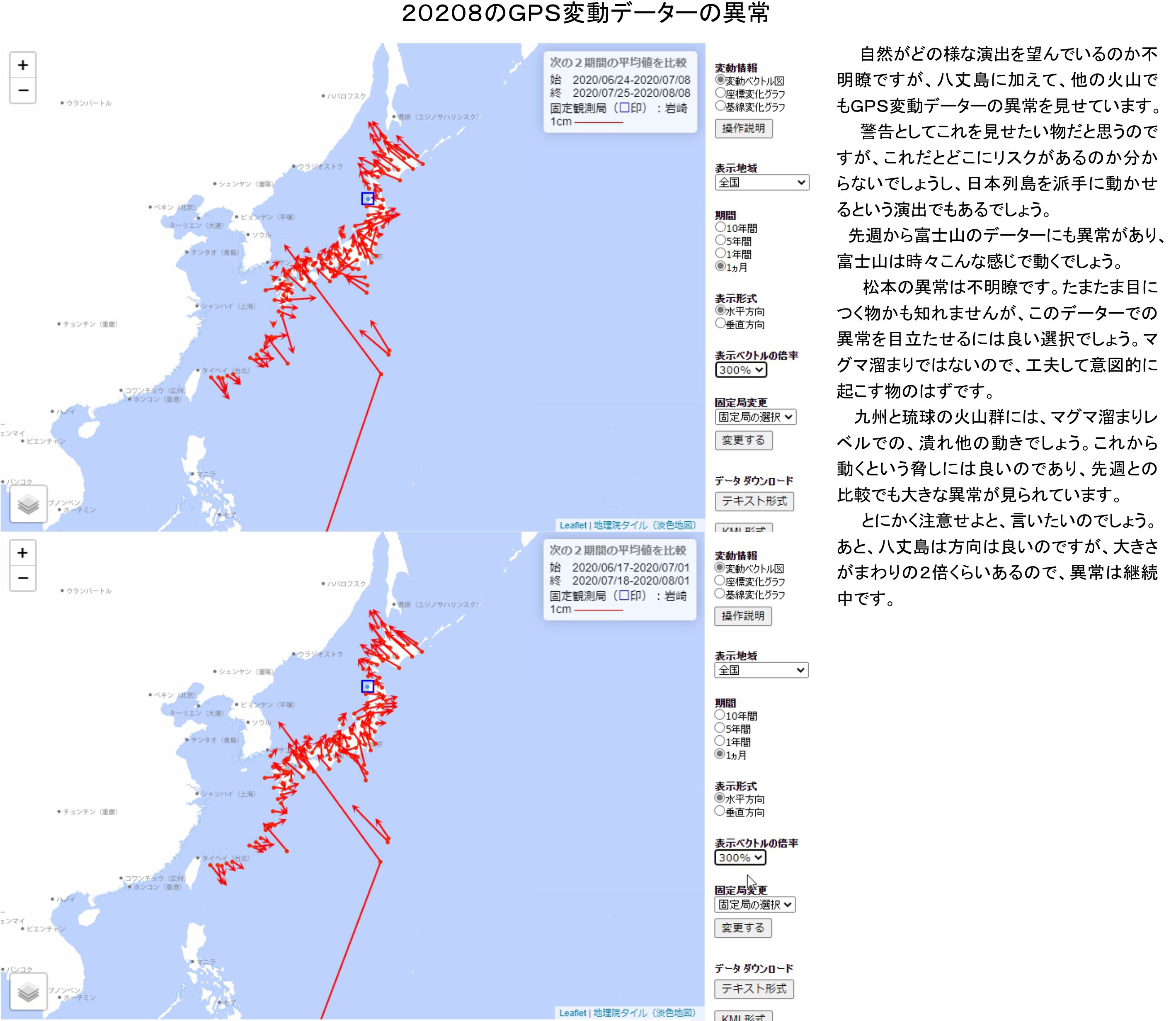 自然がどの様な演出を望んでいるのか不明瞭ですが、八丈島に加えて、他の火山でもGPS変動データーの異常を見せています。