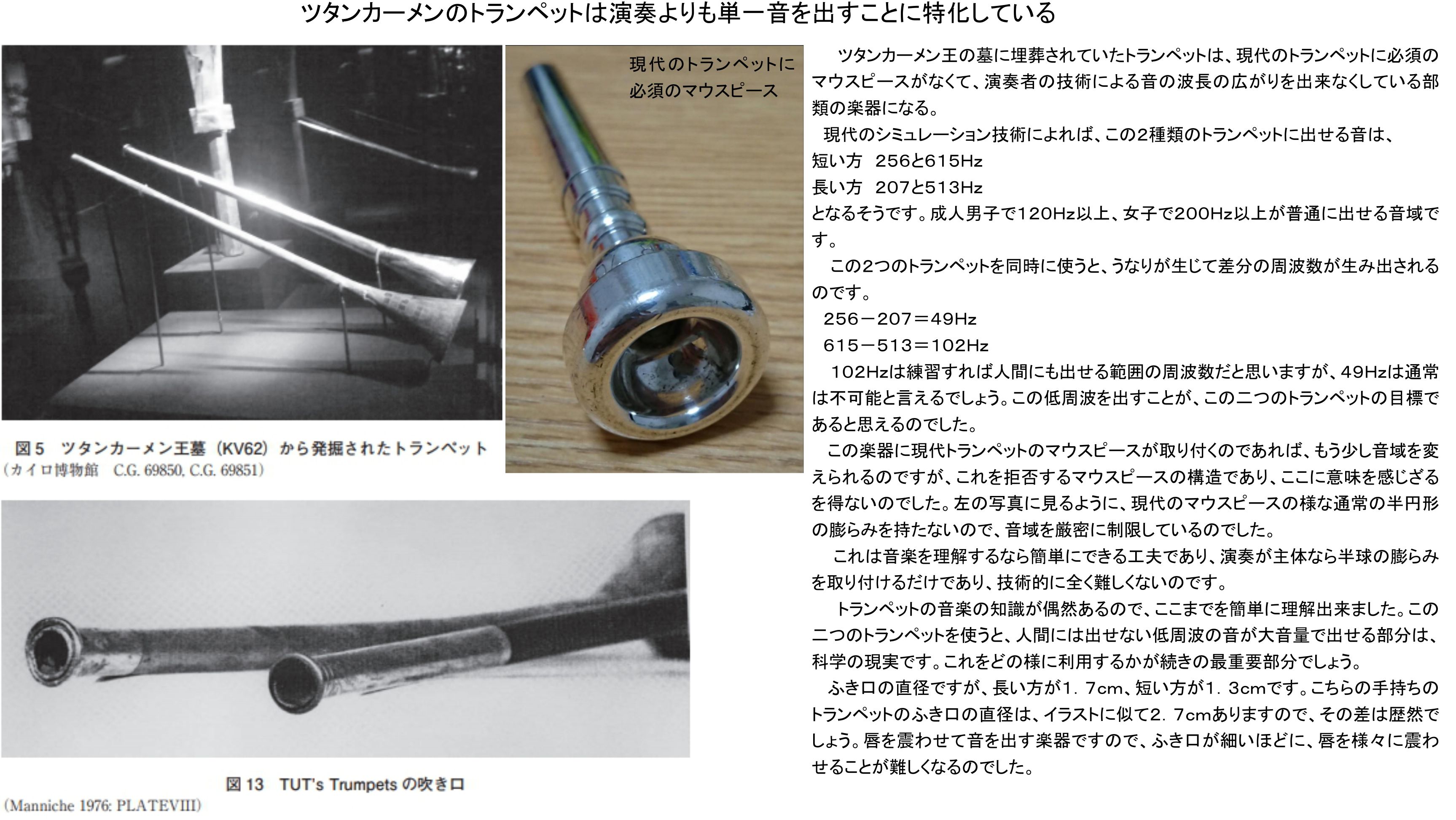 ツタンカーメン王の墓に埋葬されていたトランペットは、現代のトランペットに必須のマウスピースがなくて、演奏者の技術による音の波長の広がりを出来なくしている部類の楽器になるのです。