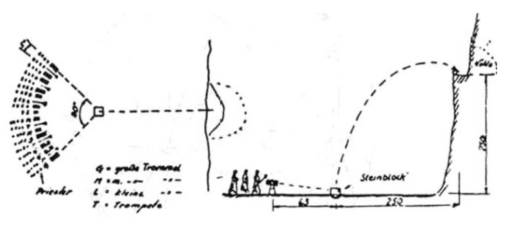 そして、その石版を中心にして半径63メートル、崖と反対側に90度分の弧を描いた線上には19の楽器が配置されていた。半径63メートルは正確な数字である。楽器は、13個の太鼓と6個のトランペット(ラグドゥンと呼ばれる、寺院で使われる長いラッパを指すと思われる)だった。
