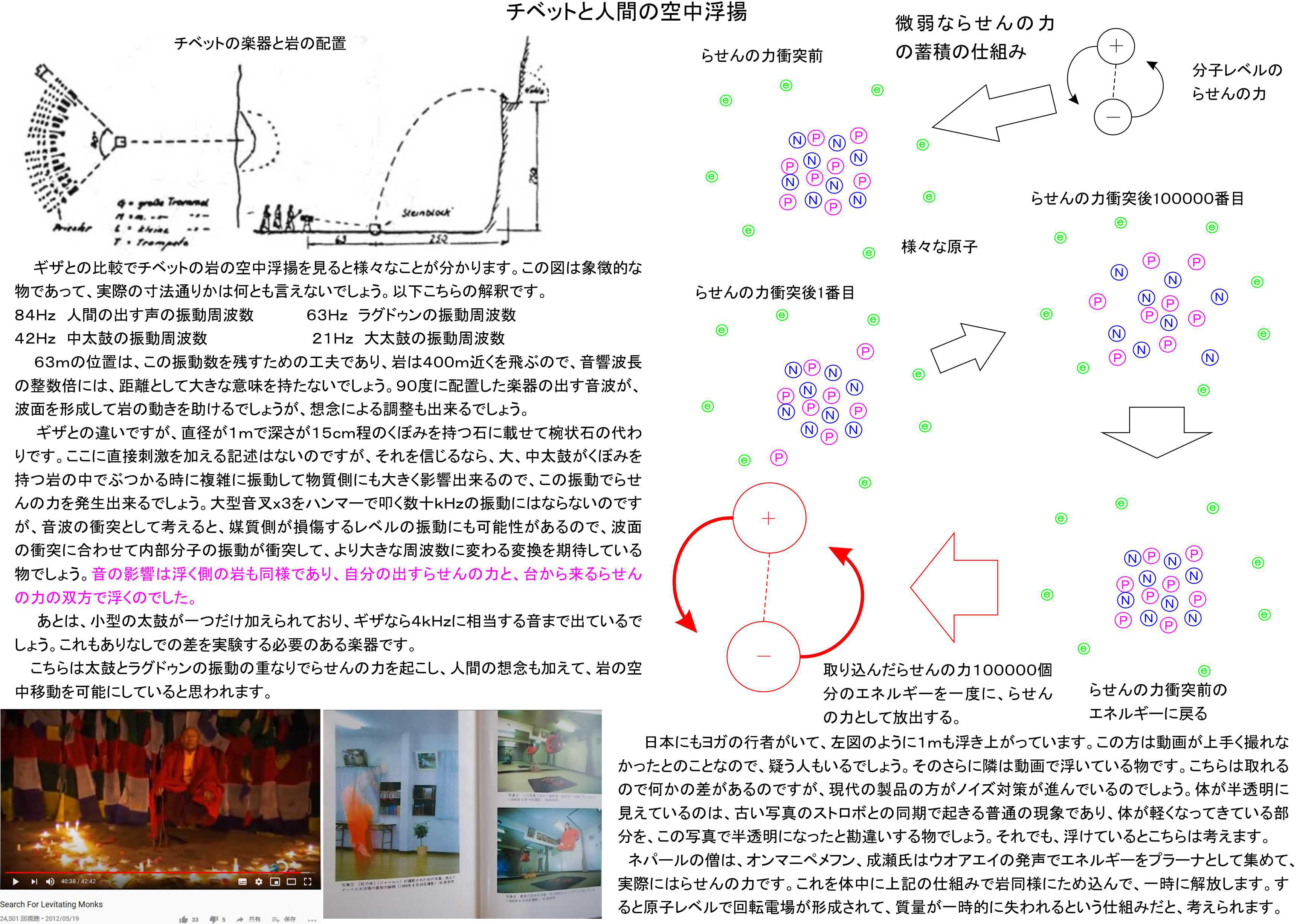ギザとの違いですが、直径が1mで深さが15cm程のくぼみを持つ石に載せて椀状石の代わりです。ここに直接刺激を加える記述はないのですが、それを信じるなら、大、中太鼓がくぼみを持つ岩の中でぶつかる時に複雑に振動して物質側にも大きく影響出来るので、この振動でらせんの力を発生出来るでしょう。大型音叉x3をハンマーで叩く数十kHzの振動にはならないのですが、音波の衝突として考えると、媒質側が損傷するレベルの振動にも可能性があるので、波面の衝突に合わせて内部分子の振動が衝突して、より大きな周波数に変わる変換を期待している物でしょう。音の影響は浮く側の岩も同様であり、自分の出すらせんの力と、台から来るらせんの力の双方で浮くのでした。