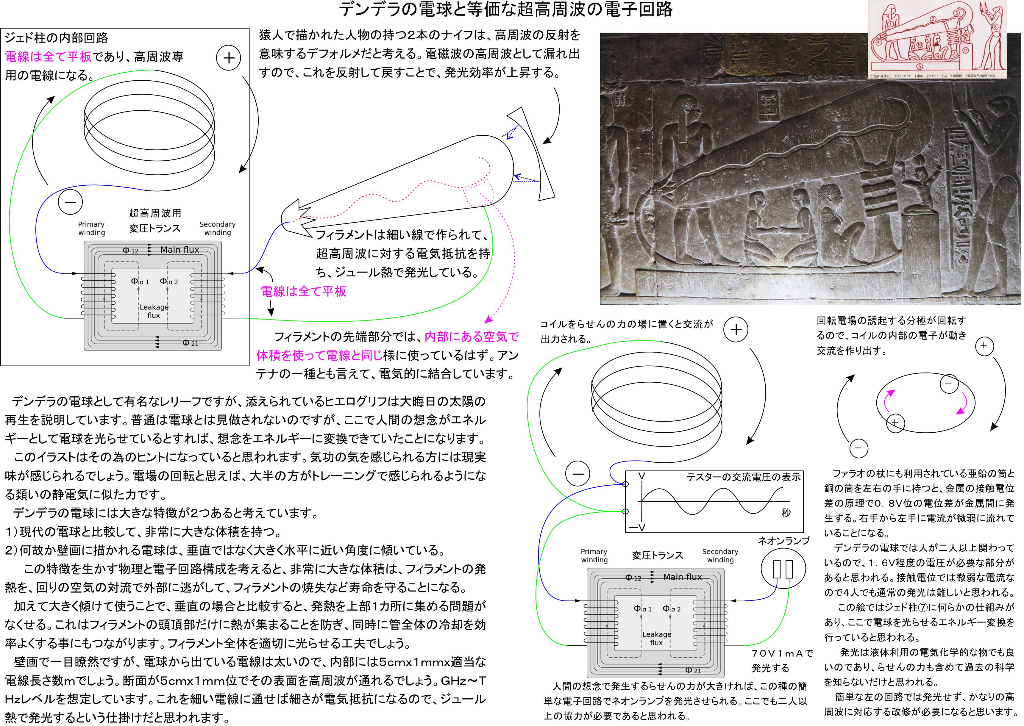 この推測通りにらせんの力が放射出来ると、この後説明する超高周波の電子回路でしかない、デンデラの電球を、特段の秘密もなく光らせることが出来るでしょう。単純に高周波の電流がフィラメントの抵抗作用で発熱して発光しているだけだとなる所です。
