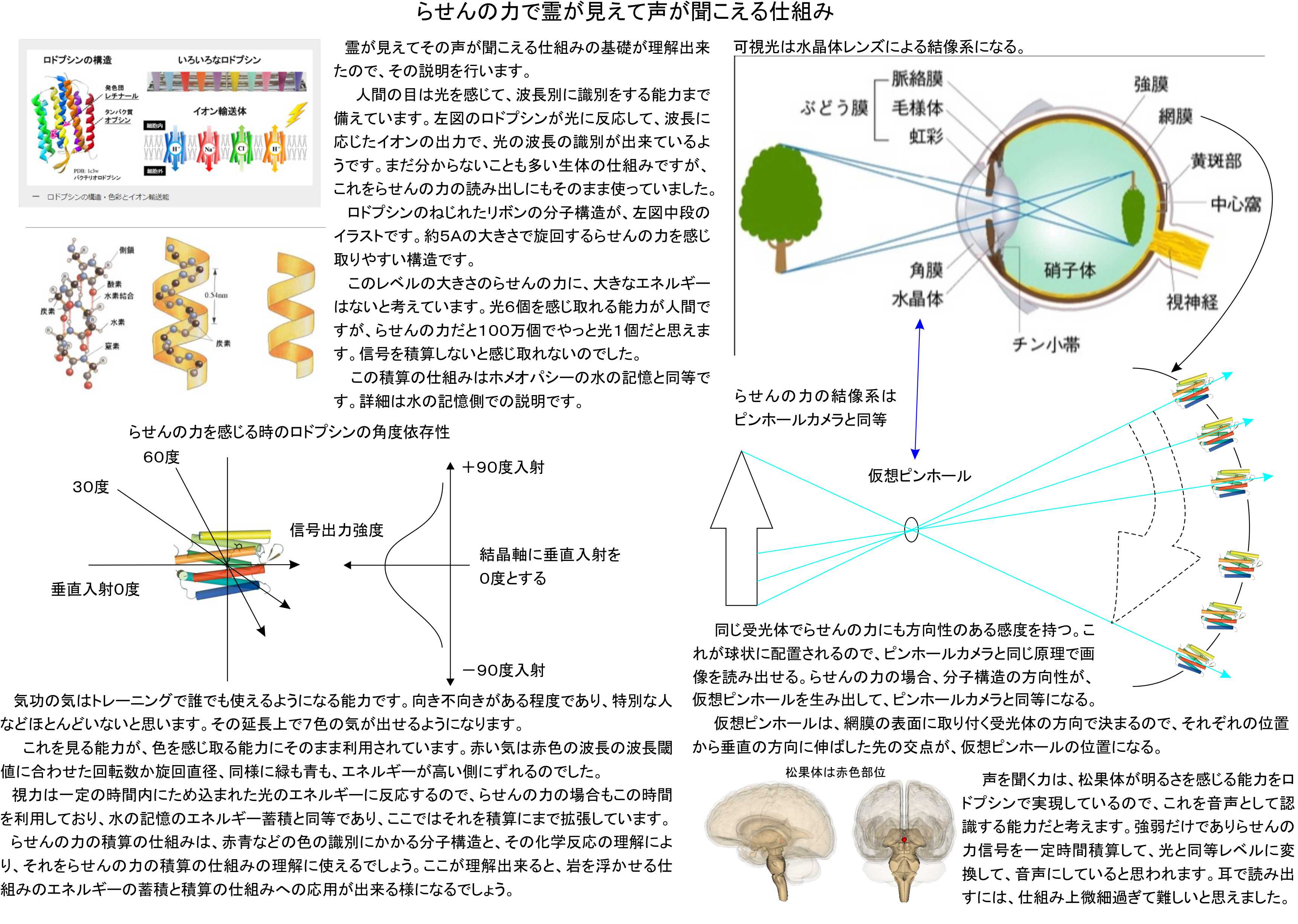 3)耳では物理的な動きをイオンチャネルで電気信号に変換しているが、このイオンチャネルは、基本的には光を感じるロドプシンと同じくらせん状の構造が複数で基本機構になる。らせんの力を受信する部分には問題がなく、残りの積分とその繰り返しが出来るかになる。