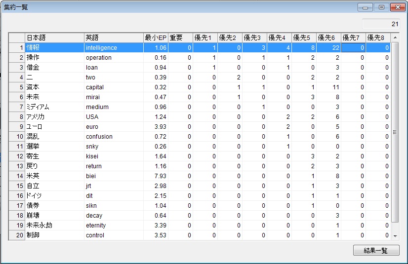 本日はこの解析結果の集約一覧という表を載せてみます。優先1~3に出されている言葉がこのメインキーワードの場所で強調されている物です。