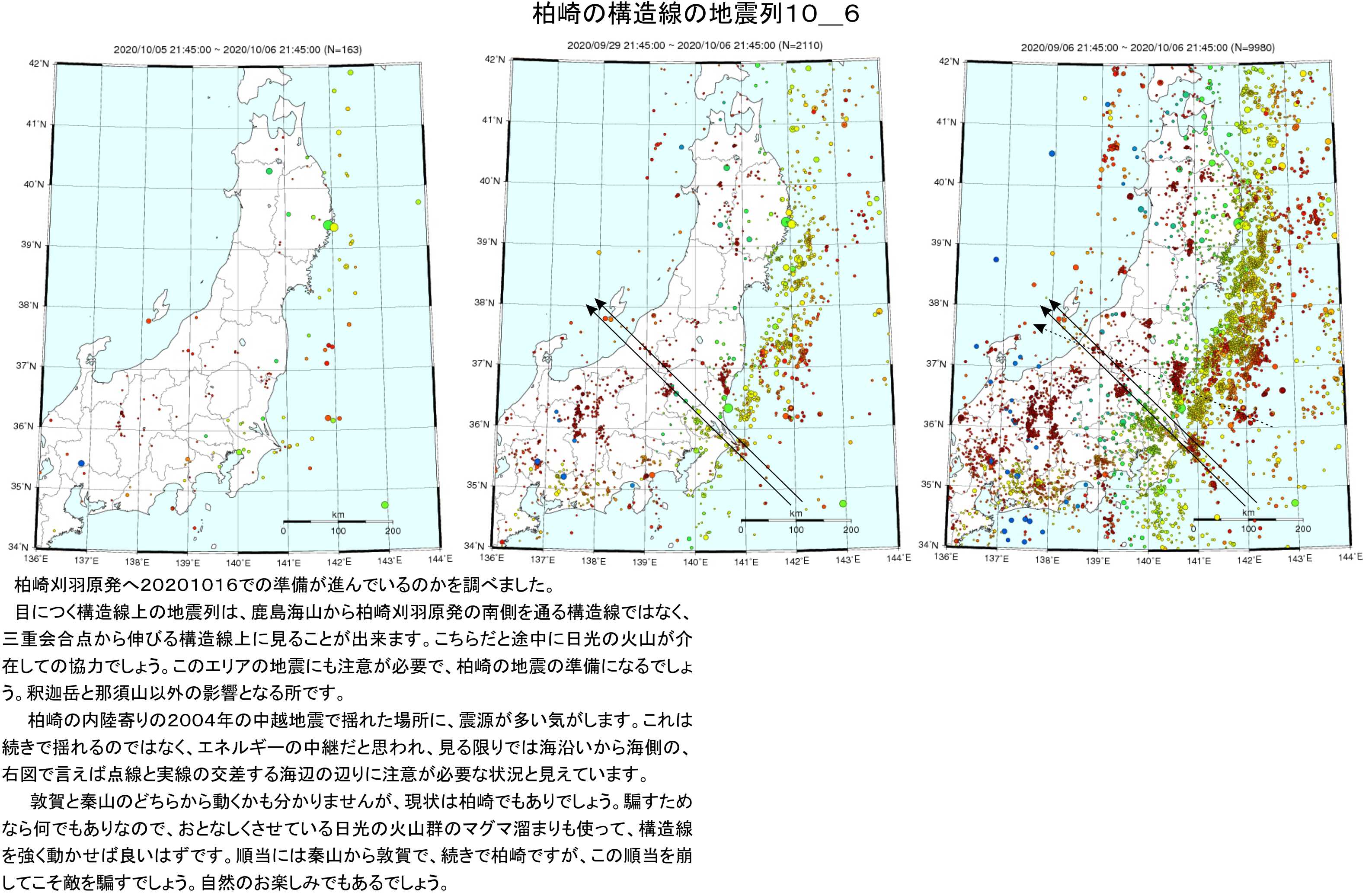 目につく構造線上の地震列は、鹿島海山から柏崎刈羽原発の南側を通る構造線ではなく、三重会合点から伸びる構造線上に見ることが出来ます。こちらだと途中に日光の火山が介在しての協力でしょう。このエリアの地震にも注意が必要で、柏崎の地震の準備になるでしょう。釈迦岳と那須山以外の影響となる所です。