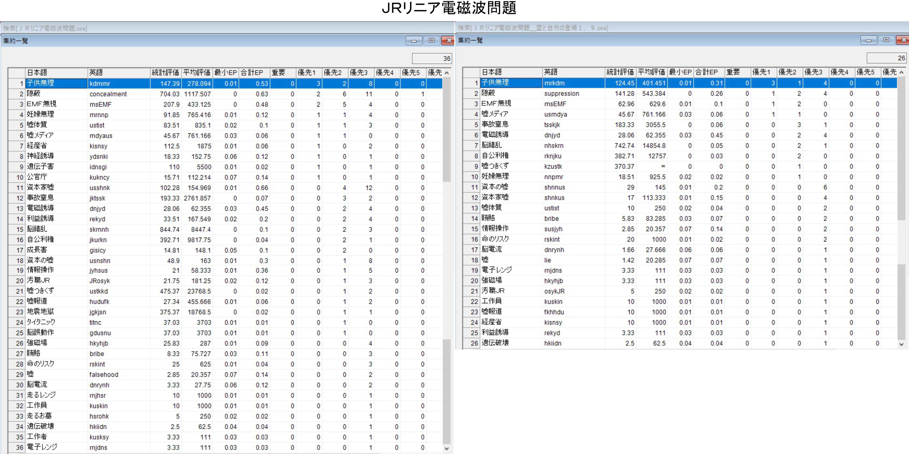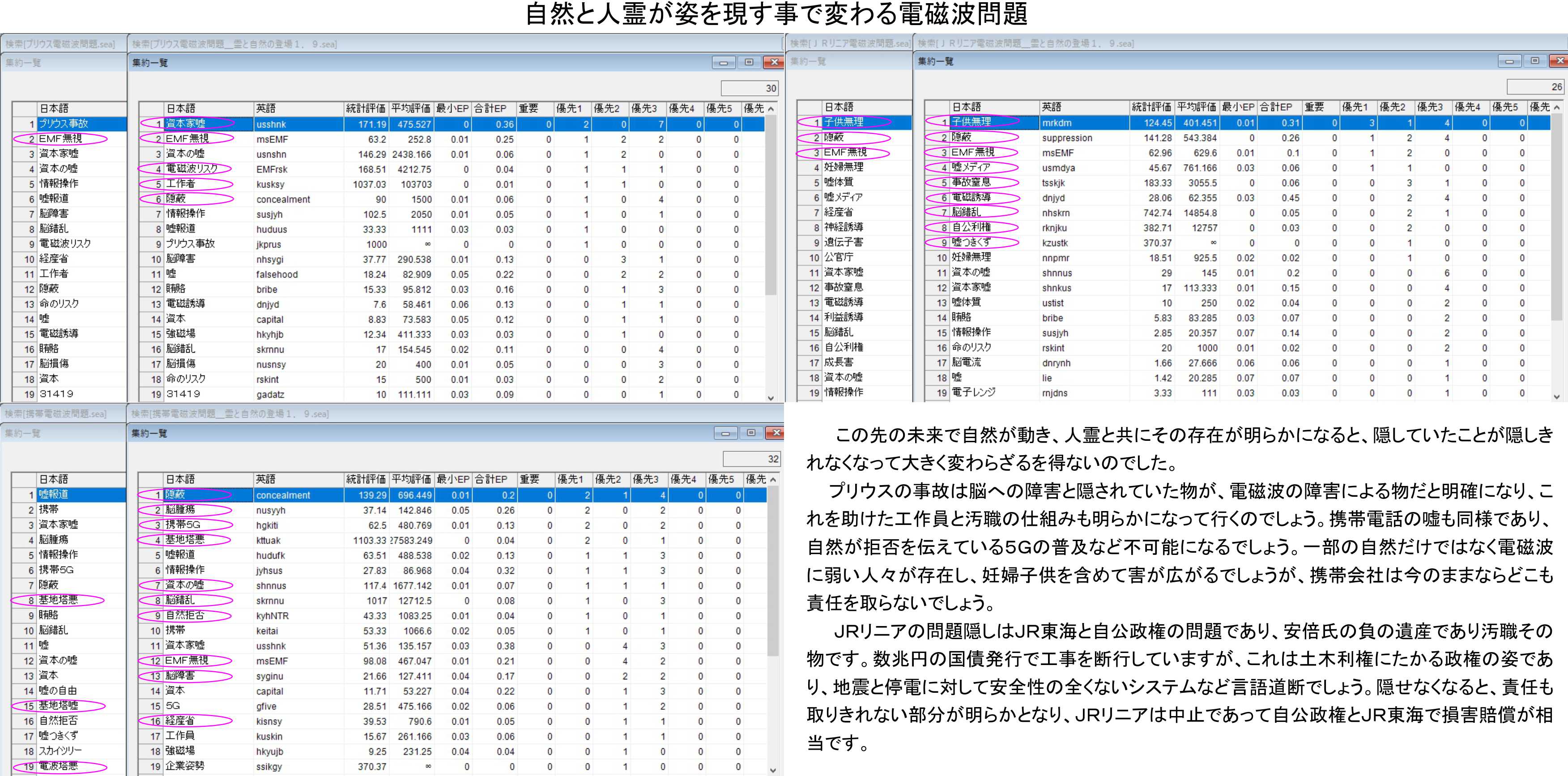 暗号の仕組みを説明すると長くなるので、メインキーワードで得られるデーターに、選んだ未来を示すフィルター処理をする事で、その未来状況を知る事が出来ると考えて下さい。リーマンショックの流れと世界大恐慌やブラックマンデーの流れをこれで説明出来ている評価法です。プリウス、携帯、JRリニアの未来を、霊と自然の登場する場合で調べました。