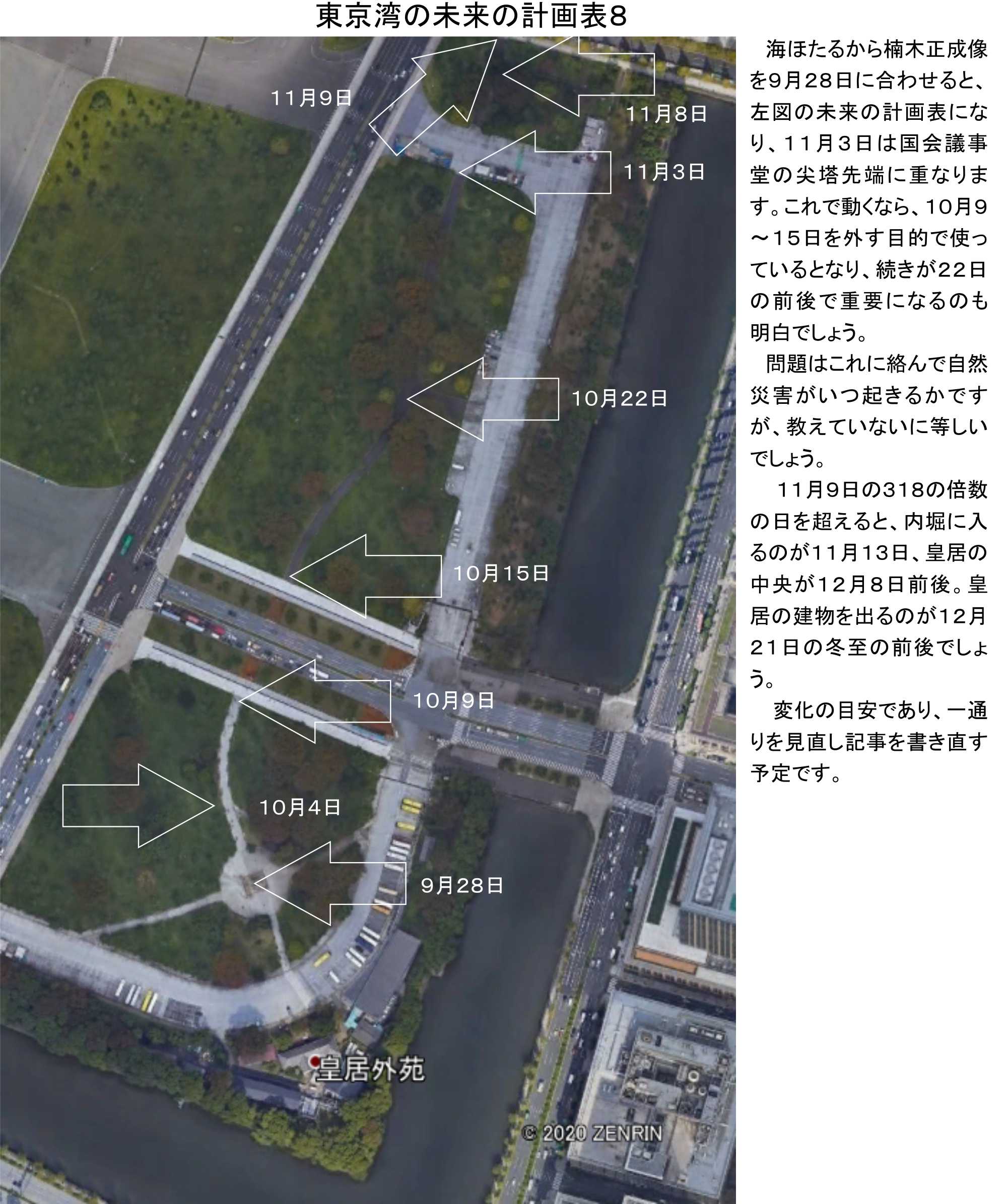 海ほたるから楠木正成像を9月28日に合わせると、イラストの左図の未来の計画表になり、11月3日は国会議事堂の尖塔先端に重なります。これで動くなら、10月9~15日を外す目的で使っているとなり、続きが22日の前後で重要になるのも明白でしょう。この通りに流れて来たと思います。
