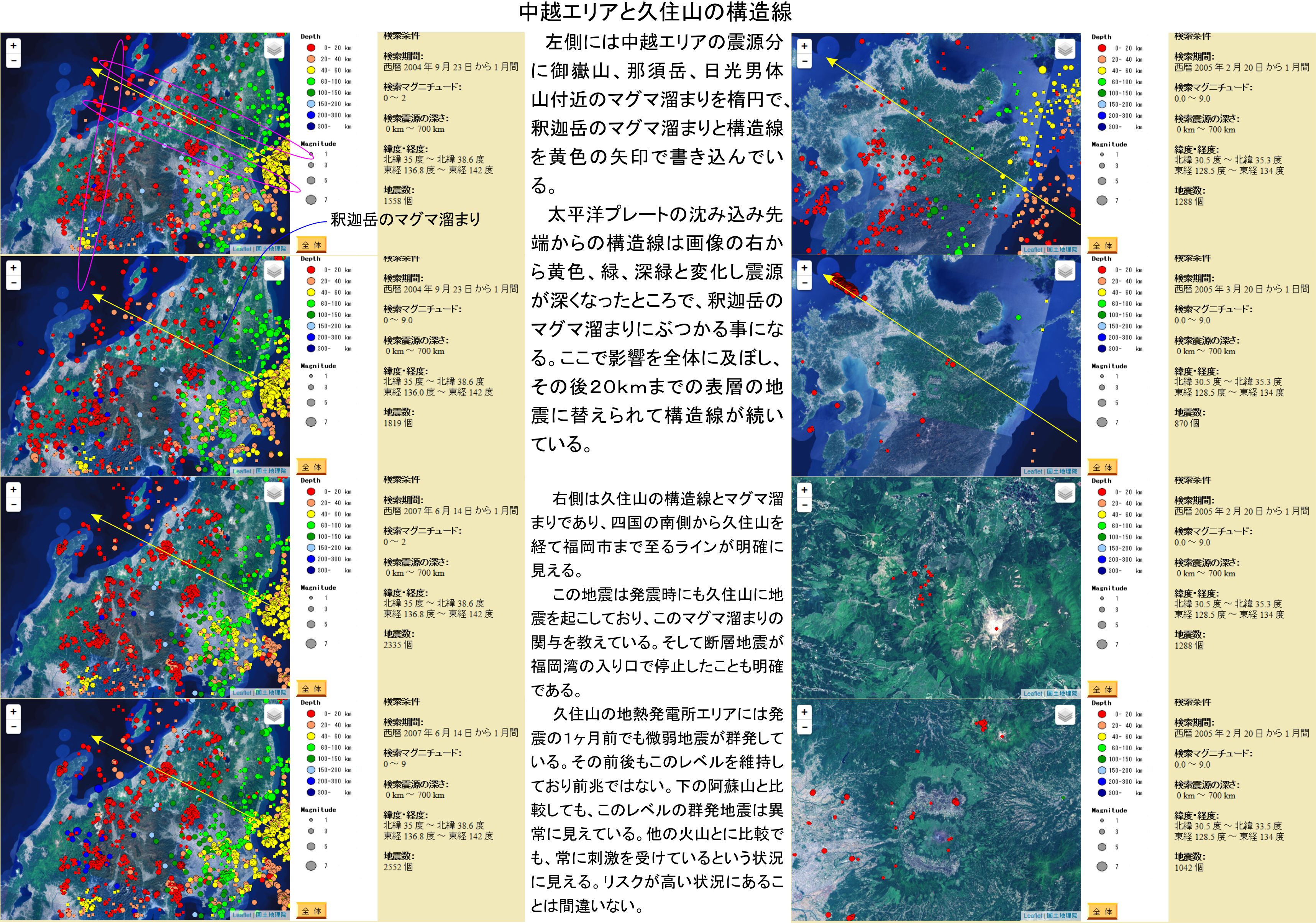 始まりの二つは1967年の営業開始後の影響の可能性があり、8年がかりです。この時に久住山は、熱の引き出しと水の追加注入で影響を受けて、マグマ溜まりの形状が変化し、それに見合う構造線の動きが起きたり、久住山としての地震が起きて今の状況に至ると思われます。2005年の福岡県西方沖地震もこの場所の影響抜きには考えられないでしょう。