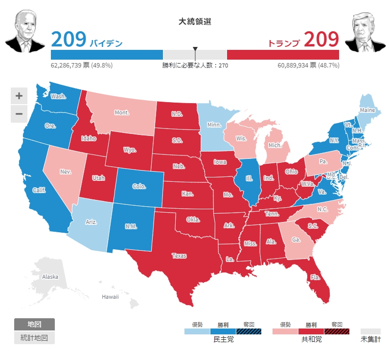 バイデン氏209人、49.7% トランプ氏209人、48.7%