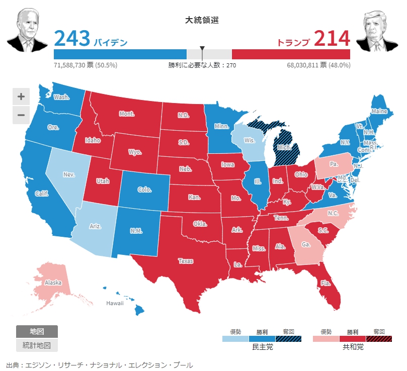 トランプ氏は非常に早い段階からこの予想をしており、郵便投票は不正の温床だと批判を続けてきました。ペンシルベニアでは郵便投票の事前開票を、共和党優位の州議会が阻止したと書かれているので、軍産議会複合体の共和党支配における大きな工作でしょう。激戦区の状況で選挙結果が出ると、早い段階で予想されて、その様に流れたのでした。
