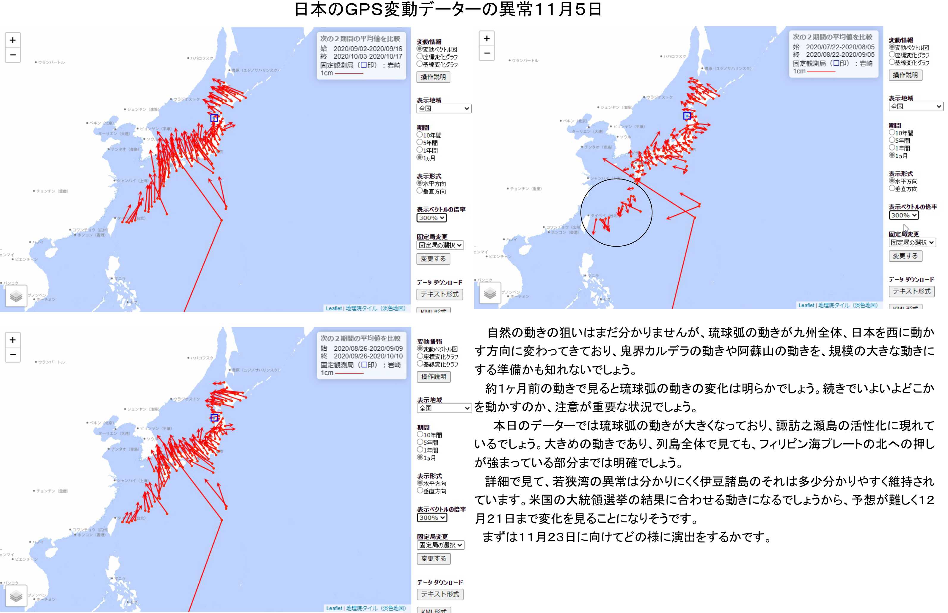 GPS変動データーの異常は引き続きだと思われます。フィリピン海プレートの動きが非常に大きくなっており、変化が分かりにくくされています。まずは九州への動きの準備ですが、2週間時間つぶしをするなら今の状況で流れるだけでしょう。