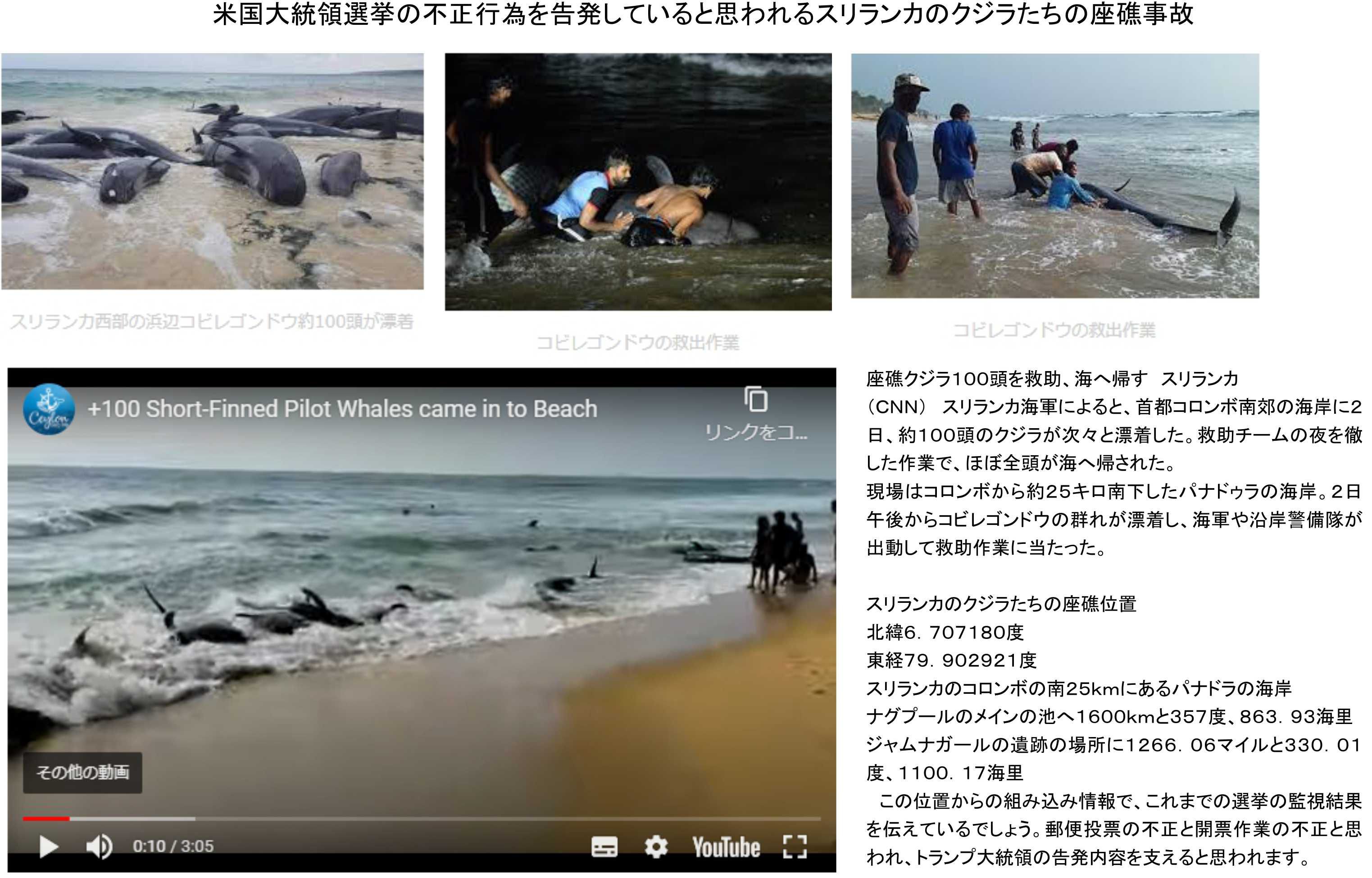 9月21日にタスマニア島で起きた大規模なクジラたちの座礁で、その発生位置からの情報が伝えられています。「汚職のバイデン氏陣営の不正のひどさを教えるタスマニア島のクジラたち1~4」にてその内容の一部を公表しています。彼らが伝える内容が多くてまだ記事を書いている途中ですが、新たに11月2日にも、今度はスリランカで約100島ほどのクジラたちの座礁事故が起き、情報を伝えてくれています。