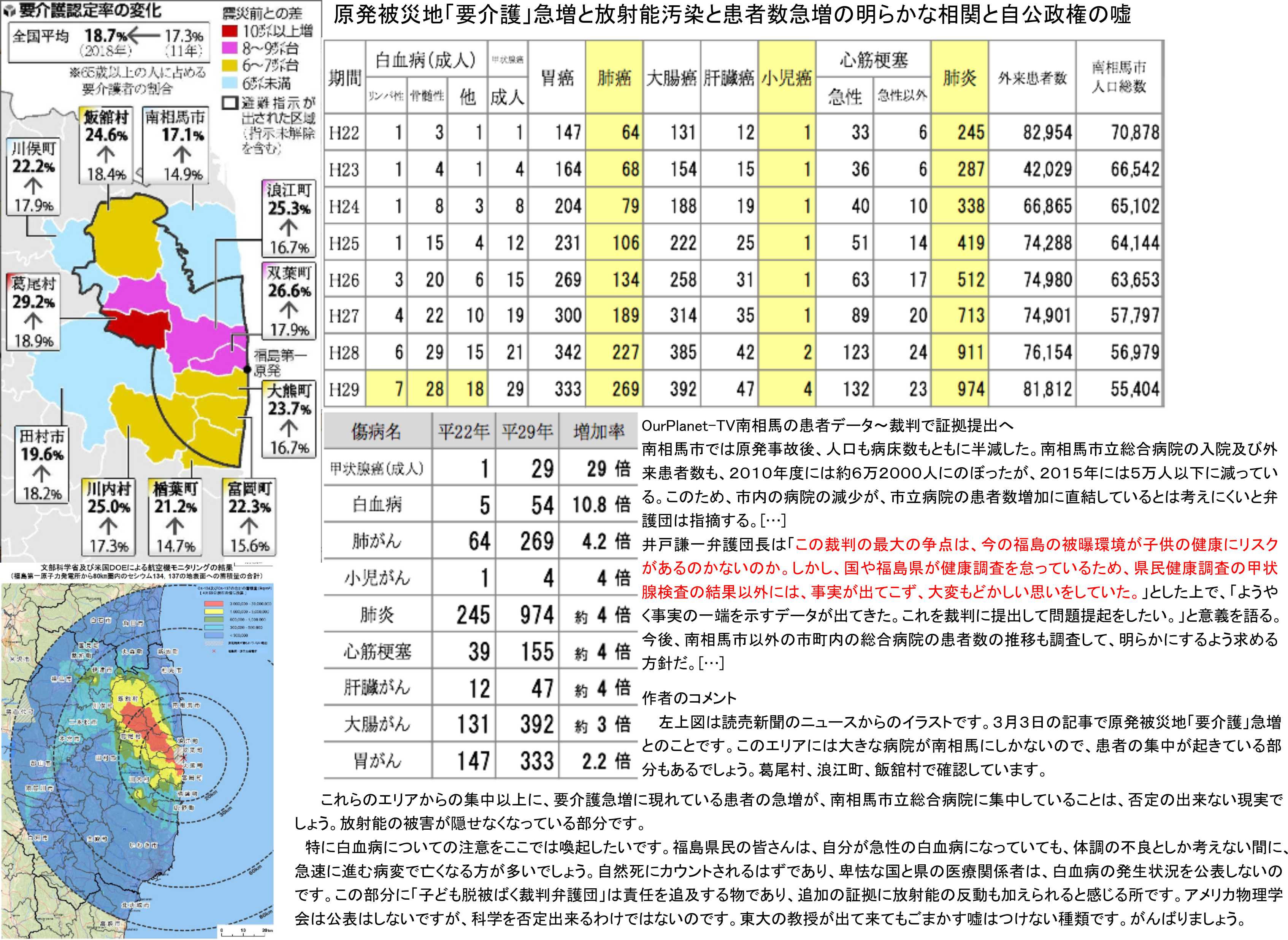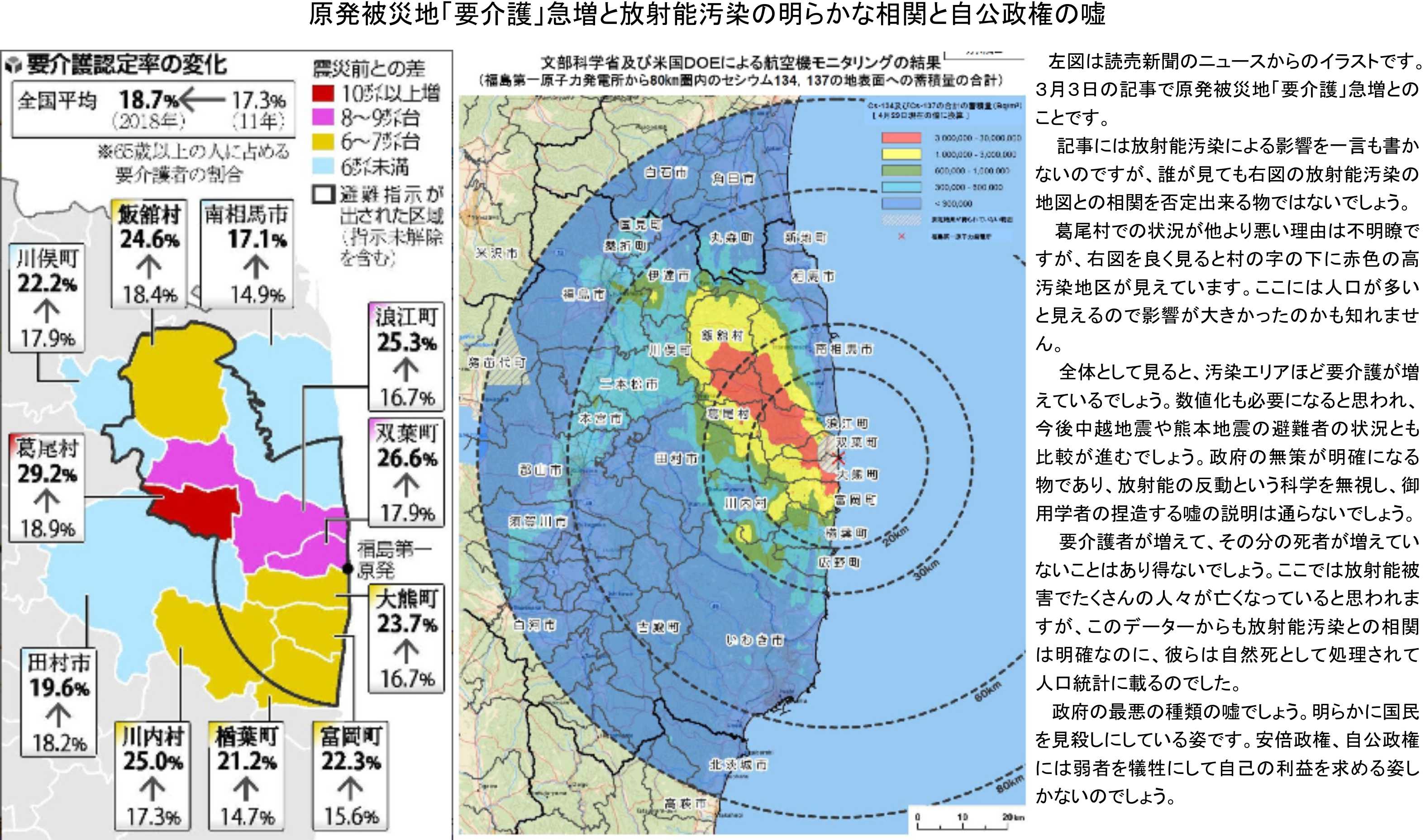 イラストの左上図はご紹介済みの3月3日の読売新聞の記事からのデーターです。多い場所で10%も要介護率が上昇しているのです。読売新聞は放射能汚染との関係を全く触れないのですが、左下の放射能汚染図から明らかなように、誰が見てもここに相関を感じられるでしょう。汚染の大きいところほど、介護率が急上昇しているのです。当然これらは死者数にも反映するはずなので、政府の人口動態に現れている、年間数万人の自然死の増加部分に含まれるでしょう。