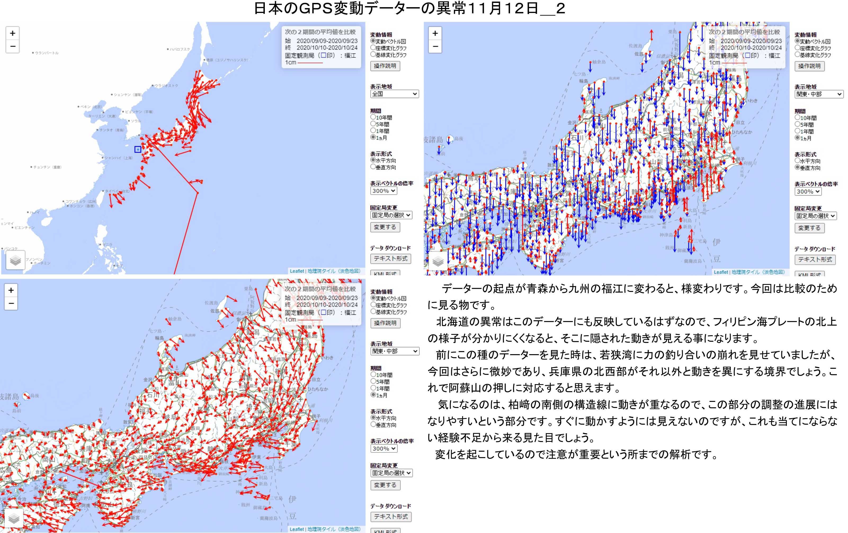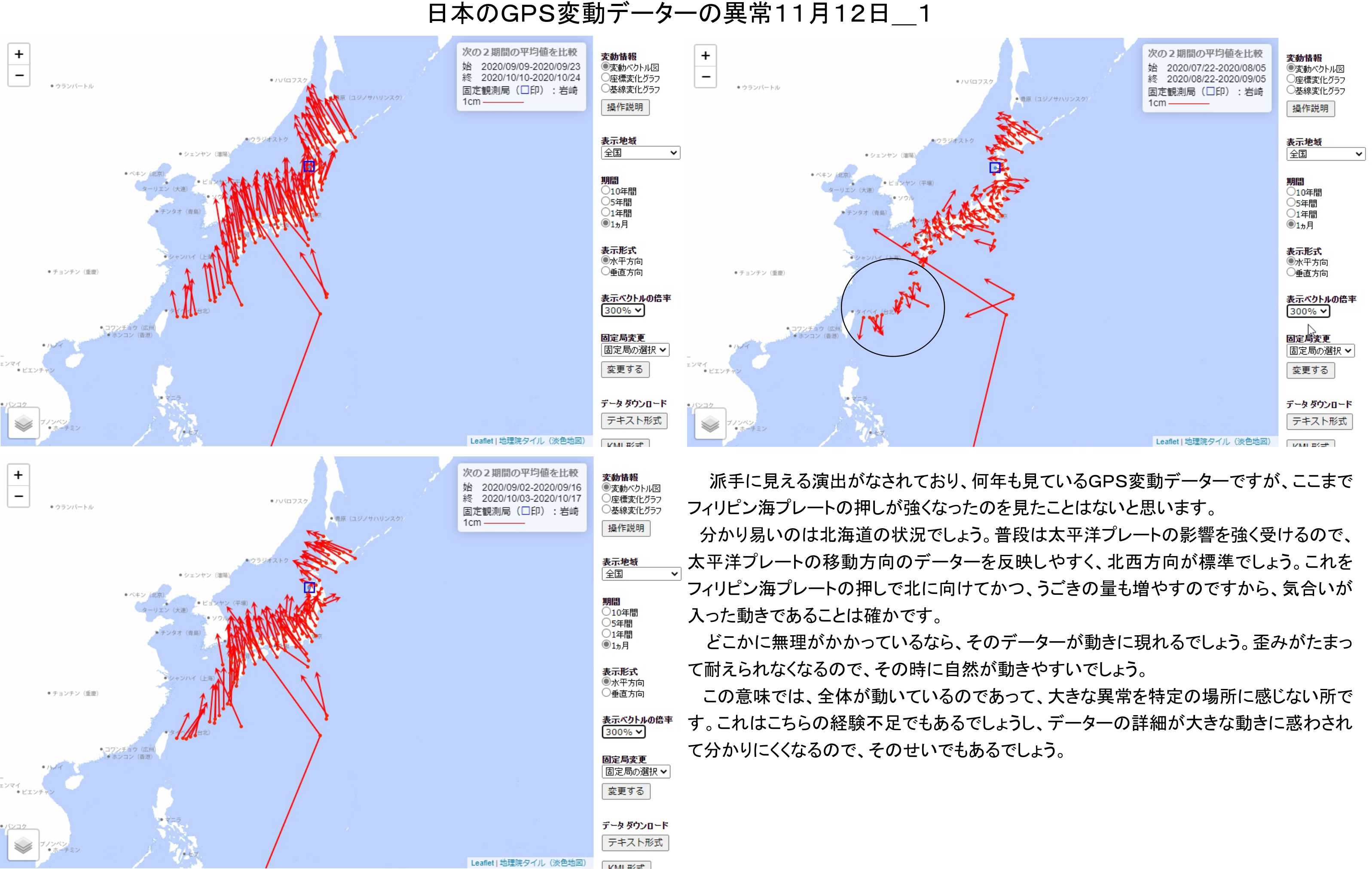 分かり易いのは北海道の状況でしょう。普段は太平洋プレートの影響を強く受けるので、太平洋プレートの移動方向のデーターを反映しやすく、北西方向が標準でしょう。これをフィリピン海プレートの押しで北に向けてかつ、うごきの量も増やすのですから、気合いが入った動きであることは確かです。