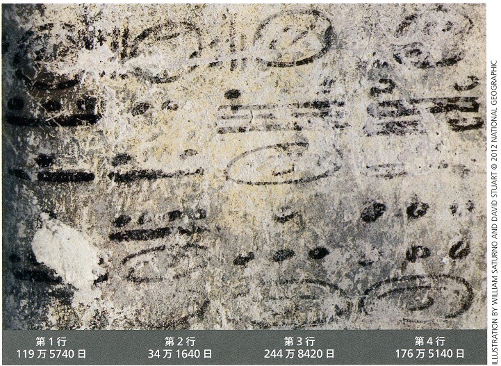 この壁画以外には、27行の数表が見つかっています。177または178日の月の動きを記録しているらしいです。