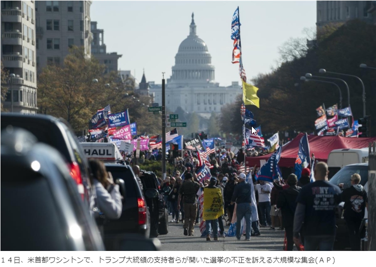 集会では支持者らが次々と登壇し「みんなが眠っている間に票が盗まれた」「メディアは敵だ」と主張。トランプ氏の名前を記した旗などを掲げ、ホワイトハウスと連邦議会議事堂を結ぶ通りを練り歩いた。米国で新型コロナウイルスの新規感染者が連日最多を更新する中、マスクを着けない人が多かった。